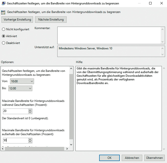 Administratoren haben wenig Arbeit mit dem Update. Neu sind zwei Gruppenrichtlinien unter „Administrative Vorlagen/Windows-Komponenten/Übermittlungsoptimierung“. Sie legen „Geschäftszeiten“ fest, um Bandbreite von Hintergrund- und Vordergrund-Downloads zu beschränken. Das soll die Internetverbindung zu Stoßzeiten entlasten.