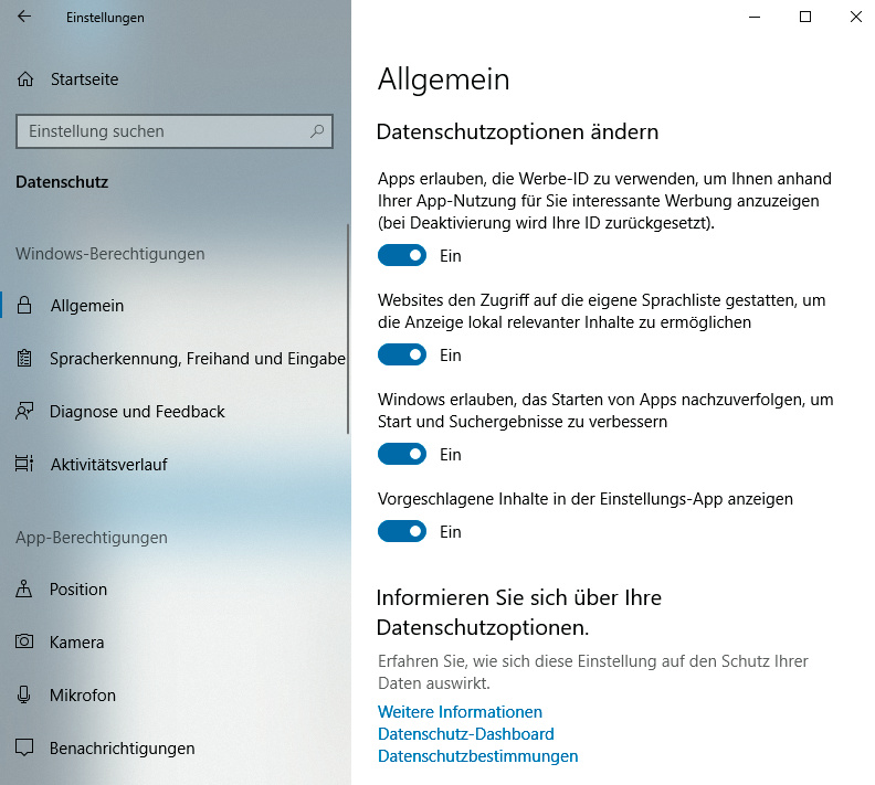 Mit einem Microsoft-Konto und aktivierter Cloud-Synchronisation kann man mit mehreren Geräten auf die gleiche Timeline zuzugreifen. Wer das nicht will, sollte in den Einstellungen „Zeitachse“ ins Suchfeld eingeben und unter „Datenschutzeinstellungen des Aktivitätsverlaufs“ Windows verbieten, Daten über die Nutzung zu sammeln und sie mit der Cloud zu synchronisieren. Anschließend können Sie unter „Gelegentlich Vorschläge in der Zeitachse anzeigen“ den Haken entfernen. Hinter dem Begriff „Vorschläge“ verstecken sich nämlich Werbeeinblendungen innerhalb der Timeline.