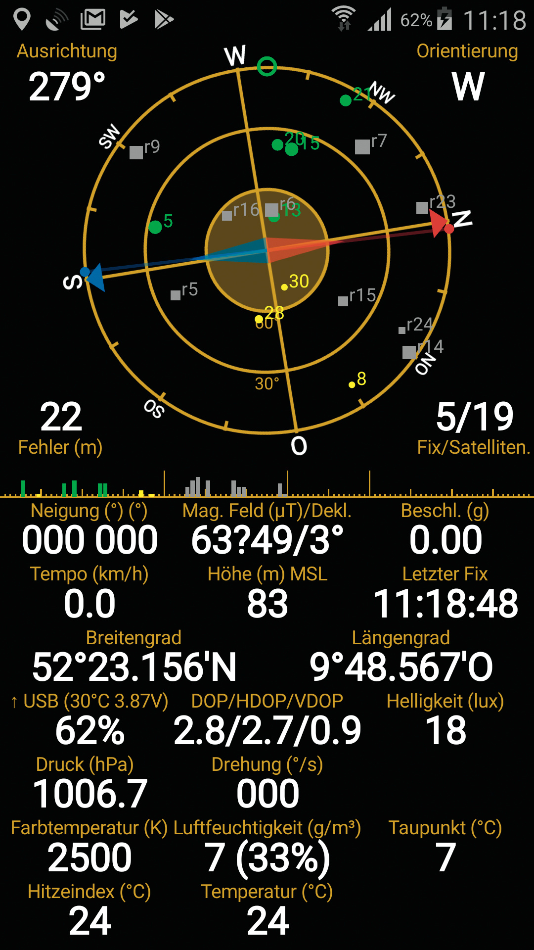 GPS Status Pro berichtet über die Farbtemperatur, das ist ein Maß für die Spektralverteilung des Lichts. Die App analysiert dafür das Licht, welches der Helligkeitssensor registriert. Auch bei abgedeckten Kameralinsen zeigt sie auf dem Galaxy S4 im prallen Wintersonnenlicht etwa 4500 K sowie 2600 K für die Weißlichtquelle unseres Fotostudios und im diffusen Tageslicht – beides sind plausible Werte. Offenbar kann also der Helligkeitssensor in diesem Handy zwischen unterschiedlichen Farben differenzieren.
