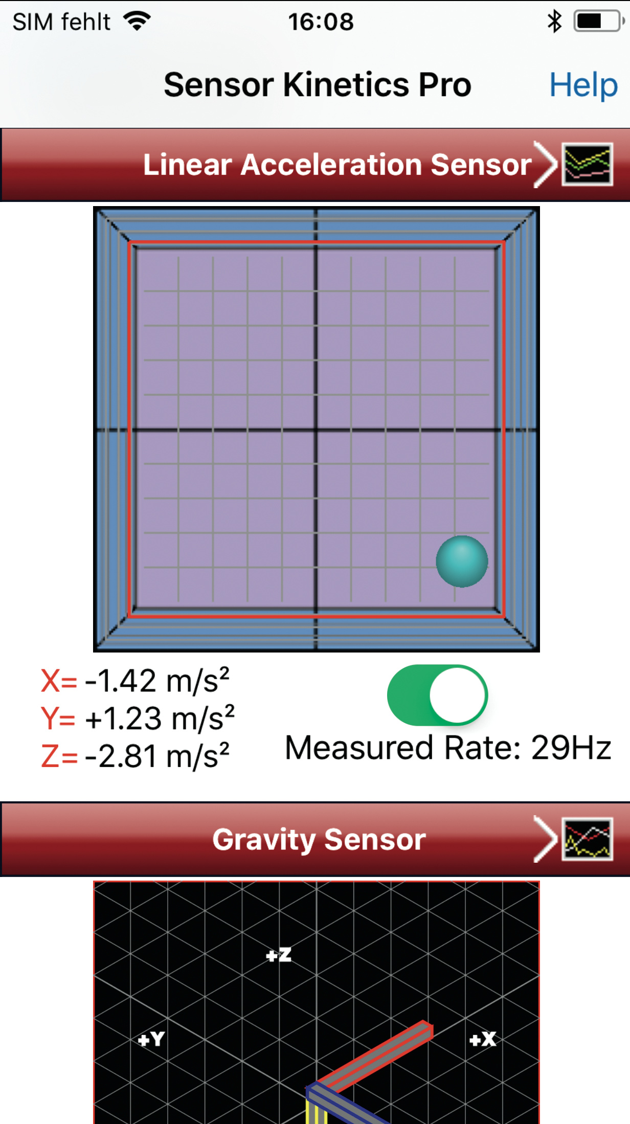 Wie unterscheidet ein Handy zwischen oben und unten? Mit einer Federwaage: Ein kleines Gewicht ist innerhalb eines Mikrochips so gelagert, dass es sich gegen eine Federkraft in einer Richtung bewegen kann. Unmittelbar daneben liegt eine fixe Leiterbahn, die zusammen mit dem Gewicht so verdrahtet ist, dass beide zusammen den Kondensator eines RC-Glieds bilden. Wird das Handy bewegt, bewegt sich unter dem Einfluss der Beschleunigung auch das Gewicht und verändert die Kapazität des Kondensators. Das lässt sich über den Wechselstrom-Widerstand des RC-Glieds messen. Durch drei derartige Sensoren lassen sich die Kräfte in X-, Y- und Z-Richtung verfolgen, so wie im Screenshot zu Sensor Kinetics auf Seite 135 sichtbar. Die Vektorsumme der drei Komponenten ergibt dann die exakte Lotrechte, wenn das Handy nicht bewegt wird. Ansonsten gibt der Sensor anhand der gemessenen Kräfte Aufschluss über die zugehörigen Beschleunigungskomponenten. Außerdem taugt das Handy als Schwingungsmesser, wenn es die Beschleunigungswerte im zeitlichen Verlauf auswertet.