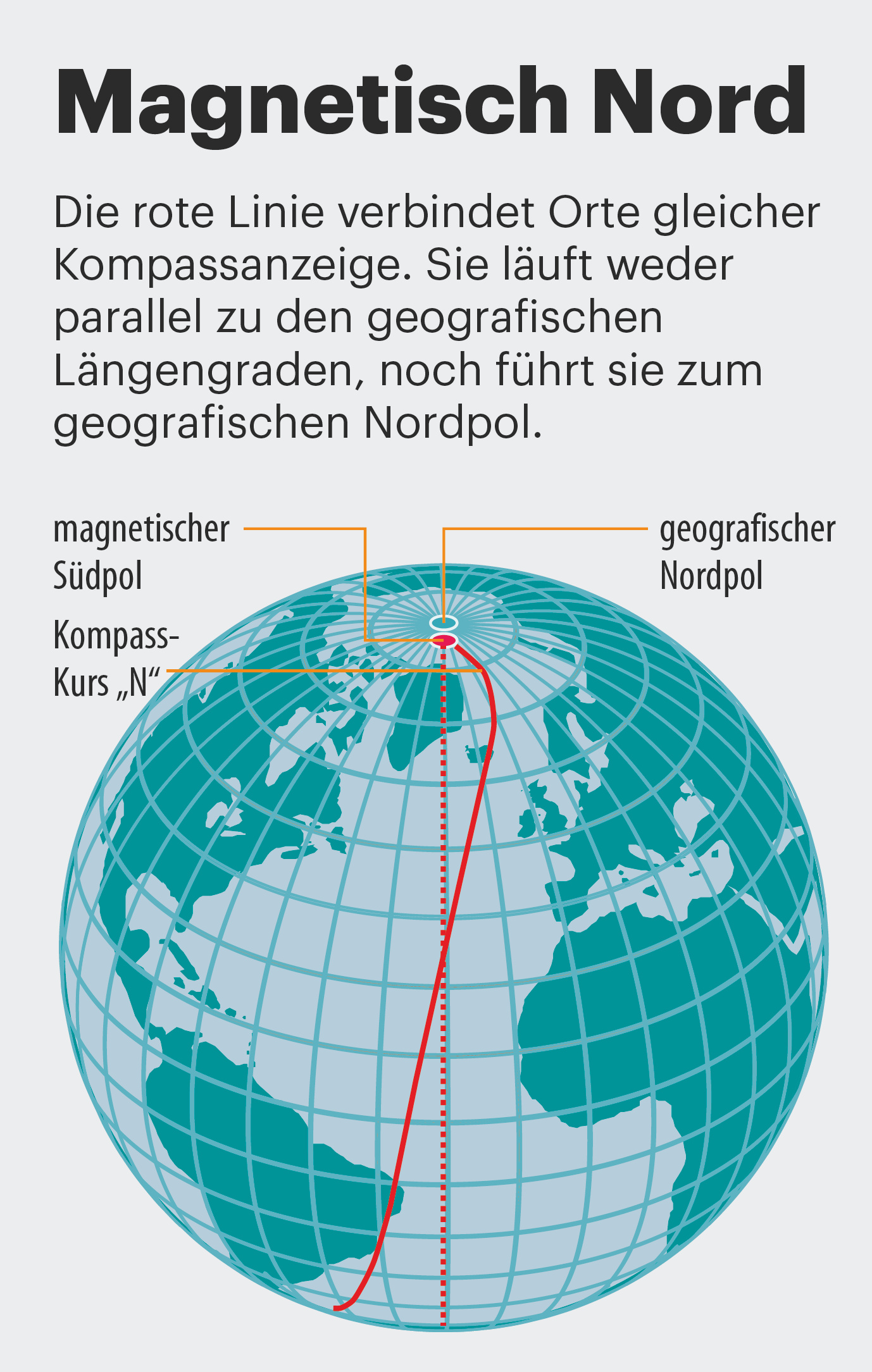 Die magnetische Nord-Anzeige weicht aufgrund von zwei Störfaktoren – der Deklination und der Deviation – von der geografischen Nord-Anzeige ab. Die Deklination rührt von Unregelmäßigkeiten des Erdmagnetfelds und daher, dass der geografische Nordpol nicht mit dem magnetischen übereinstimmt.