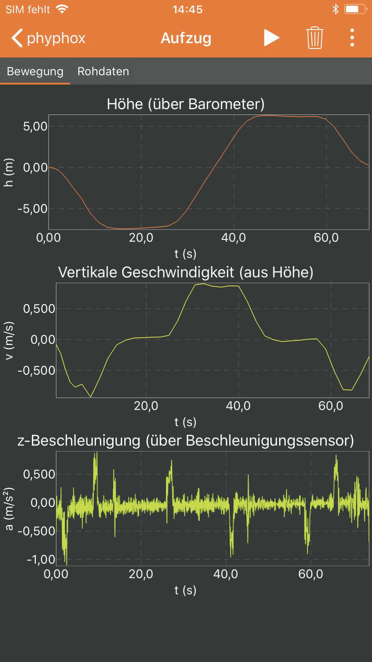 Der Screenshot zur App Phyphox ist nach einer Fahrstuhlfahrt entstanden. Er zeigt die gleichmäßigen Zu- und Abnahmen der Höhe, die daraus abgeleiteten Steig- und Sinkgeschwindigkeiten sowie die vertikale Beschleunigung bei jedem Anfahren und Anhalten des Fahrstuhls.