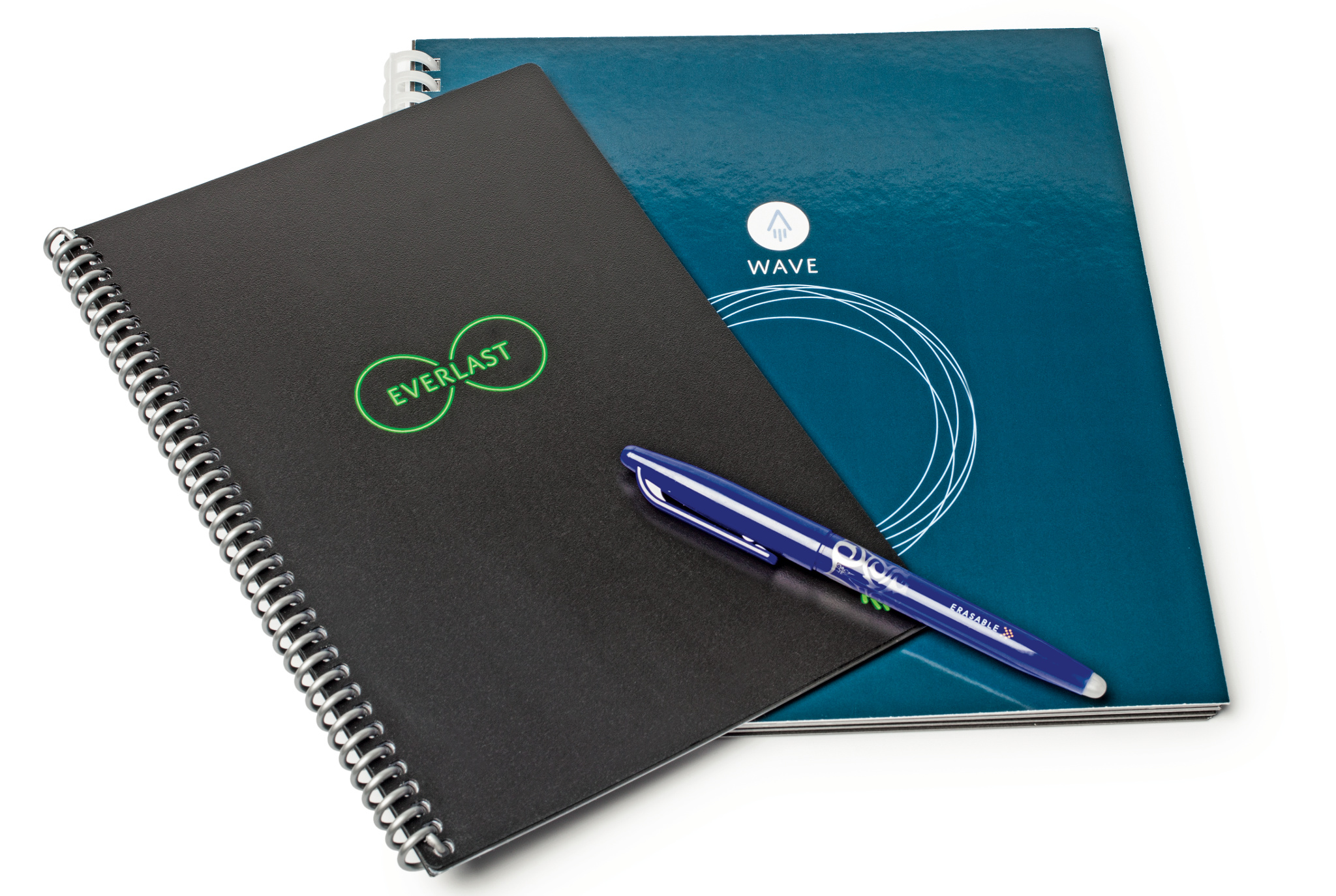 Die beiden Notizbücher Everlast und Wave von Rocketbook lassen sich mit einem feuchten Tuch oder in der Mikrowelle löschen und sind deshalb immer wieder verwendbar. Um die Notizen zu erhalten, fotografiert man sie vorher per App und synchronisiert sie mit zahlreichen Cloud-Diensten.