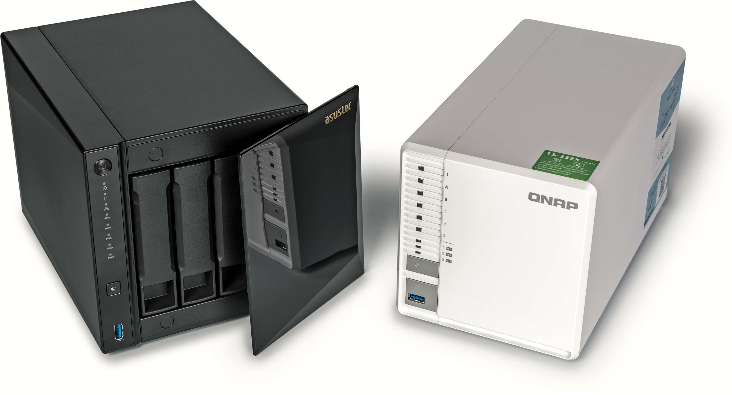 Der wichtigste technische Unterschied zwischen dem Asustor- und dem QNAP-NAS: Das AS4004T mit seinem Dual-Core-Prozessor hat einen 10GBase-T-Port für reguläre LAN-Kabel (RJ45), während das TS-332X mit Quad-Core-CPU einen SFP+-Port für Glasfasermodule oder Direct-Attach-Kabel aufweist. Weil Letztere höchstens 2 Meter lang sein dürfen, muss das TS-332X nah beim 10-Gigabit-Switch stehen, damit keine zusätzliche Investition für Glasfasertechnik fällig wird (2 SFP+-Module und passendes Patchkabel).