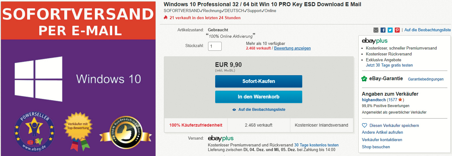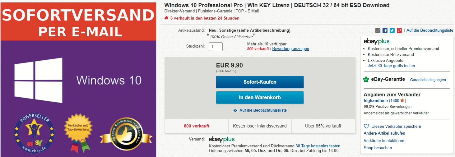 130 Euro für eine Professional-Version sind viel Geld, verglichen mit den Angeboten, die auf Handelsplattformen wie eBay gemacht werden, wenn man nach „Windows 10 Pro Key“ sucht: Die Händler unterbieten sich gegenseitig: 6,99 Euro, 5,49 Euro, 4,99 Euro, 4,89 Euro, 3,99 Euro! Nur so hat man eine Chance, von Kunden gefunden zu werden, die nach Preis sortieren. Sie alle versprechen „Blitzversand“, „100 % Original“ und „Vollversion“. In den Beschreibungen wird stets darauf hingewiesen, dass es kein physisches Produkt gibt – der Kunde bekommt stattdessen innerhalb von 30 Sekunden einen Schlüssel und einen Downloadlink zugeschickt und muss nicht auf eine Postlieferung warten. Die Händler berufen sich auf das Urteil des Europäischen Gerichtshofs (EuGH) aus dem Jahr 2012 zu Oracle-Download-Software und versprechen, ganz legal gebrauchte Schlüssel weiterzuverkaufen.