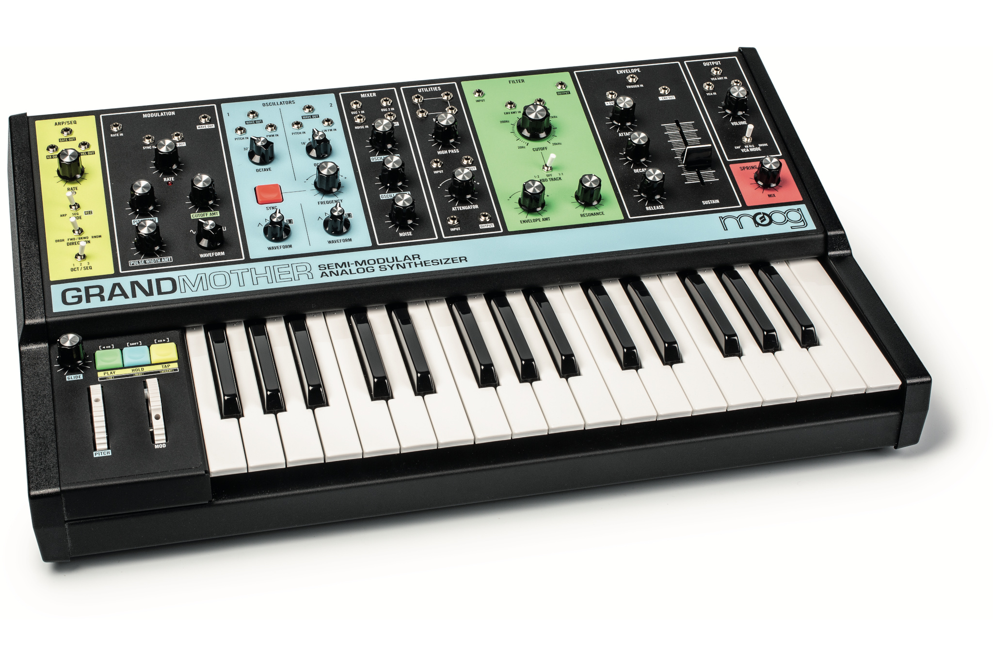 Von sich aus bringt Grandmother bereits alle wichtigen Komponenten zur Klangerzeugung mit: zwei Oszillatoren (hellblau), eine Modulations-Sektion, einen Mixer, zwei Filter (grün), einen Verstärker, einen Hüllkurvengenerator mit ADSR-Verlauf und als Bonbon einen echten Federhall (rot) mit mechanischer Feder. Das Keyboard mit 32 anschlagdynamischen Tasten wird unterstützt von einem umschaltbaren Arpeggiator und Sequencer (gelb). Die aufgedruckten bunten Felder auf der Front sorgen für eine bessere Übersicht, weil sie die einzelnen Sektionen der Klangerzeugung unterteilen.