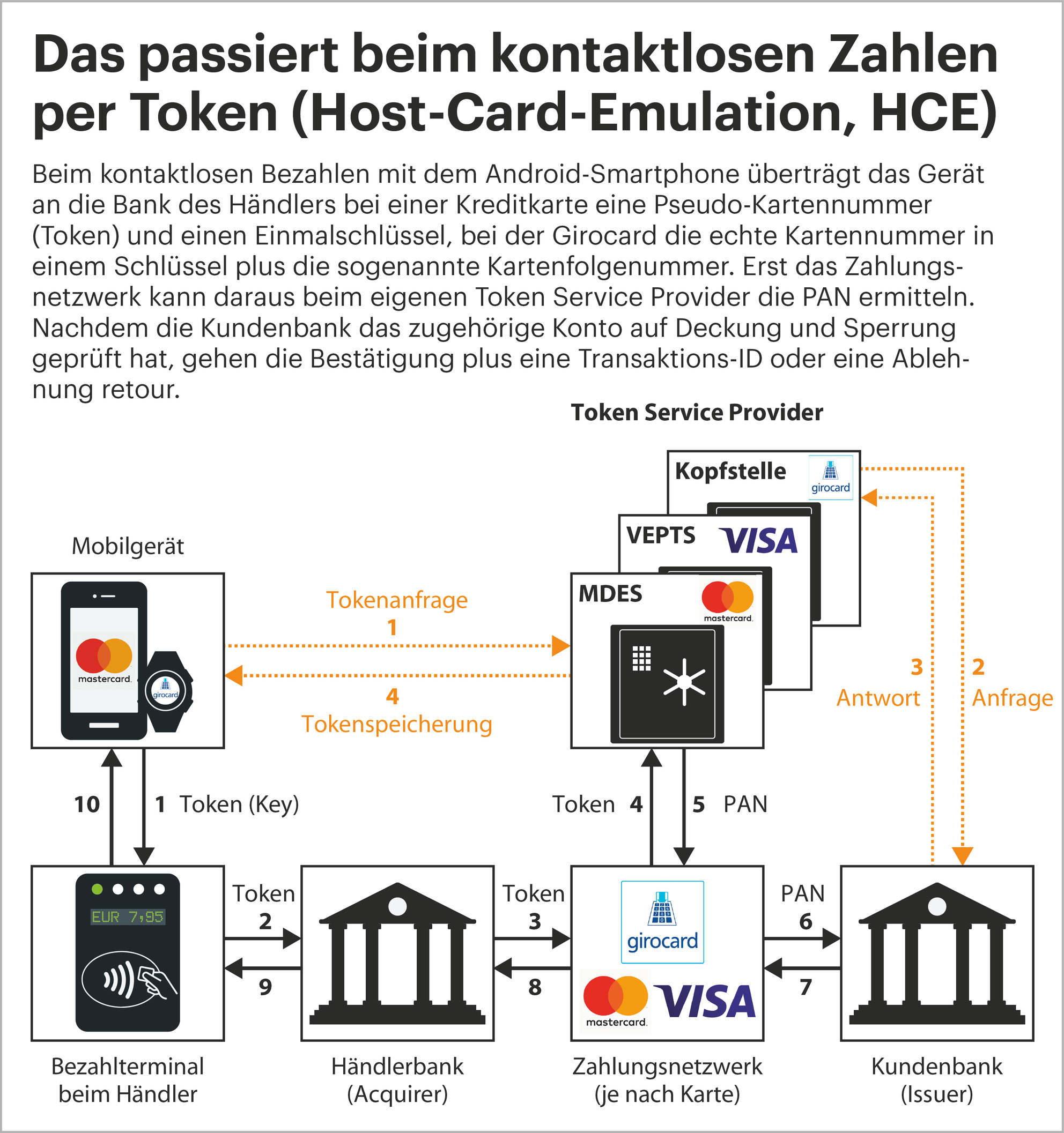 Das Token ist eine Pseudo-Kreditkartennummer, die nicht dem Original (Personal Account Number, PAN) entspricht. Das Zahlungsnetzwerk – beispielsweise VisaNet für Visa-Karten – erzeugt das Token, sobald Sie die Karte auf Ihrem Gerät hinterlegen. Bei den Use Keys handelt es sich um kryptografische Einmal-Schlüssel, die in einem speziell gesicherten Bereich des Betriebssystems gespeichert sind. Der NFC-Chip sendet sie gemeinsam mit dem Token. Um beide zusätzlich zu schützen, verweigern Bezahl-Apps auf gerooteten Handys den Dienst.