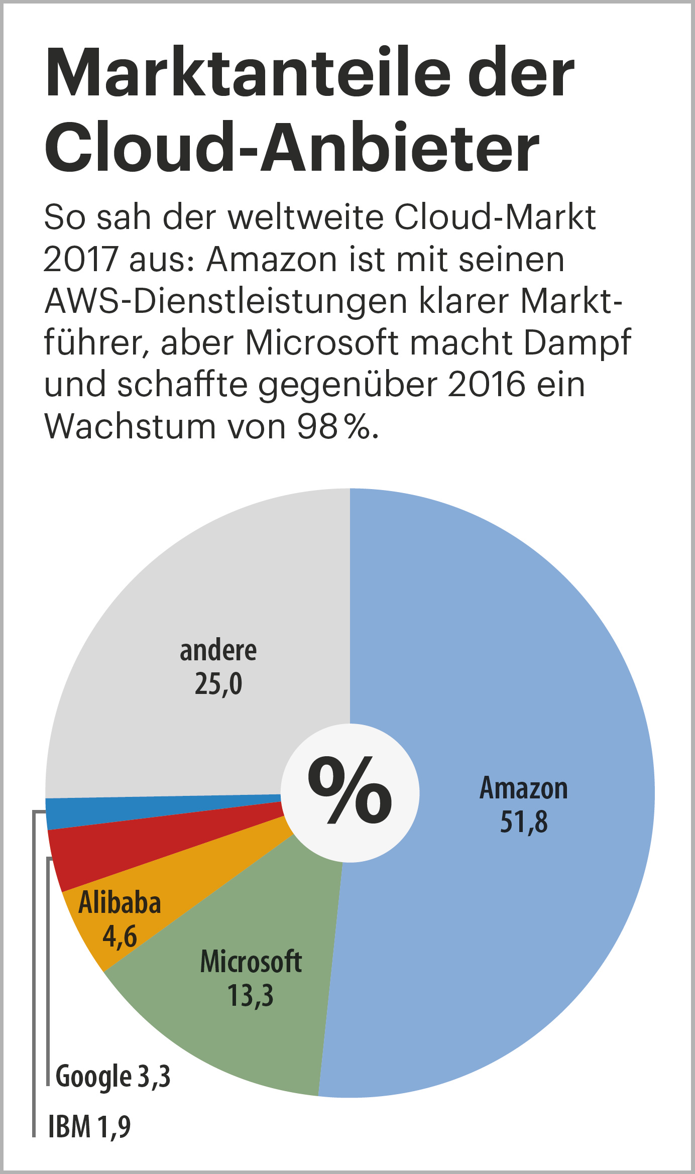 Rechenkapazität zu mieten, statt sie sich in Form von physischen Computern zu kaufen, ist in den letzten Jahren vor allem ein Unternehmensthema gewesen. Zu den Pionieren gehörte der Internethändler Amazon, der 2006 seine „Amazon Web Services“ (AWS) gründete und die „Elastic Compute Cloud“ (EC2) vorstellte – AWS ist bis heute Marktführer beim Cloud-Computing. Zwei Jahre später kam Google mit seiner App Engine, 2010 startete Microsoft mit Azure. Das sind die drei größten Akteure in der Wolke, sie alle bieten als grundlegende Dienstleistung IaaS an, also „Infrastructure as a Service“, sprich: Braucht man ein bisschen (oder viel) Rechenpower oder Speicherplatz, kann man sich diese einfach kurzfristig mieten und damit den eigenen Rechner beziehungsweise die eigene Rechnerfarm unterstützen. Auf IaaS bauen etliche andere „aaSe“ auf, von A (AaaS, Analytics as a Service) bis Z (ZaaS, Zenoss as a Service, für Netzwerk-Monitoring), Kuriositäten wie MaaS (Malware as a Service) inklusive.
