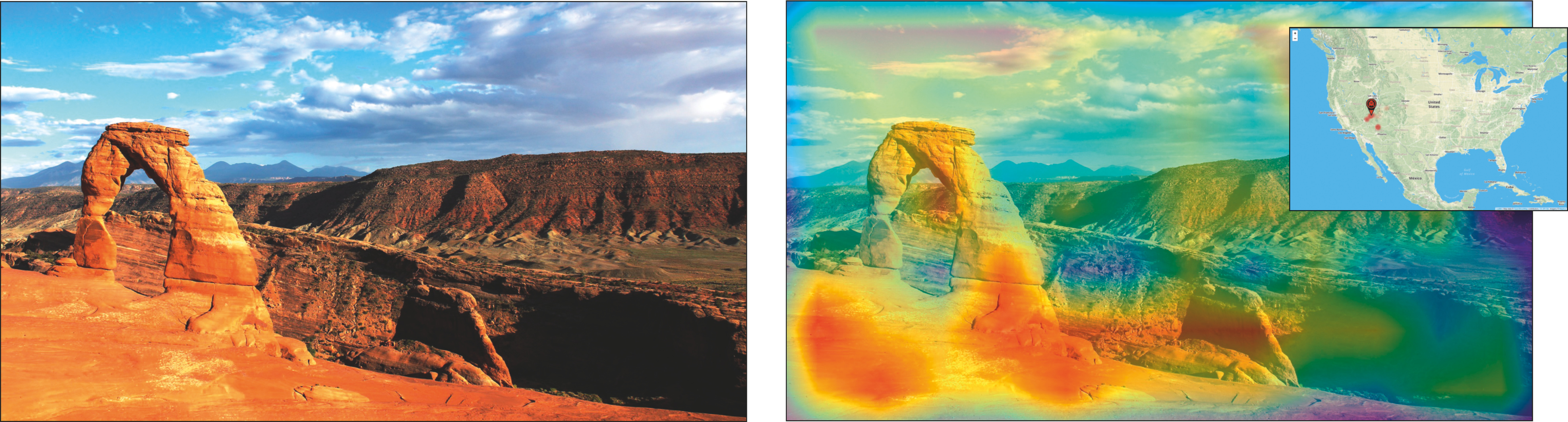 Beim c’t-Test mit eindeutigen Ortsaufnahmen zeigten sich genau diese Probleme recht klar. Eine stimmungsvolle Aufnahme aus der Hamburger Speicherstadt wurde von der TIB-KI eindeutig zugeordnet und sogar auf wenige Straßenzüge genau lokalisiert. Aber schon eine auffällige Felsformation am Colorado River, der sogenannte Delicate Arch, ein eigentlich sehr beliebtes Fotomotiv, wird zwar korrekt in der Nähe des Grand Canyon verortet, aber dann doch mit erstaunlicher Bestimmtheit ein paar Hundert Meilen nach Westen verlegt.