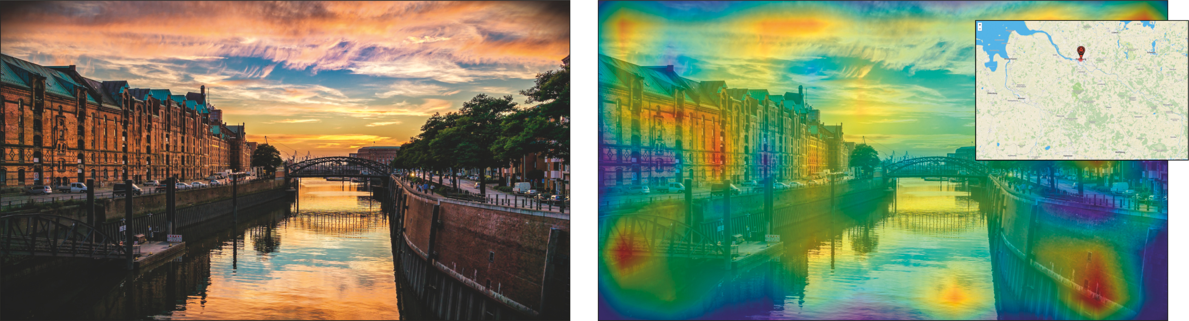 Die TIB-Webseite bietet Einblick in die Entscheidungsvorgänge der KI. Die sogenannte Scene Classification gibt einen Score-Wert aus, der in der Regel mit klarem Votum bestimmt, ob das Foto eine Stadtszene, Natur oder eine Indoor-Aufnahme zeigt. Noch informativer ist die Class Activation Map, also eine Heatmap, die auf dem Eingangsfoto farblich markiert, welche Bildbereiche für die Klassifizierung relevant waren.