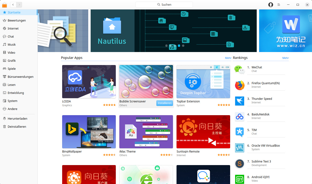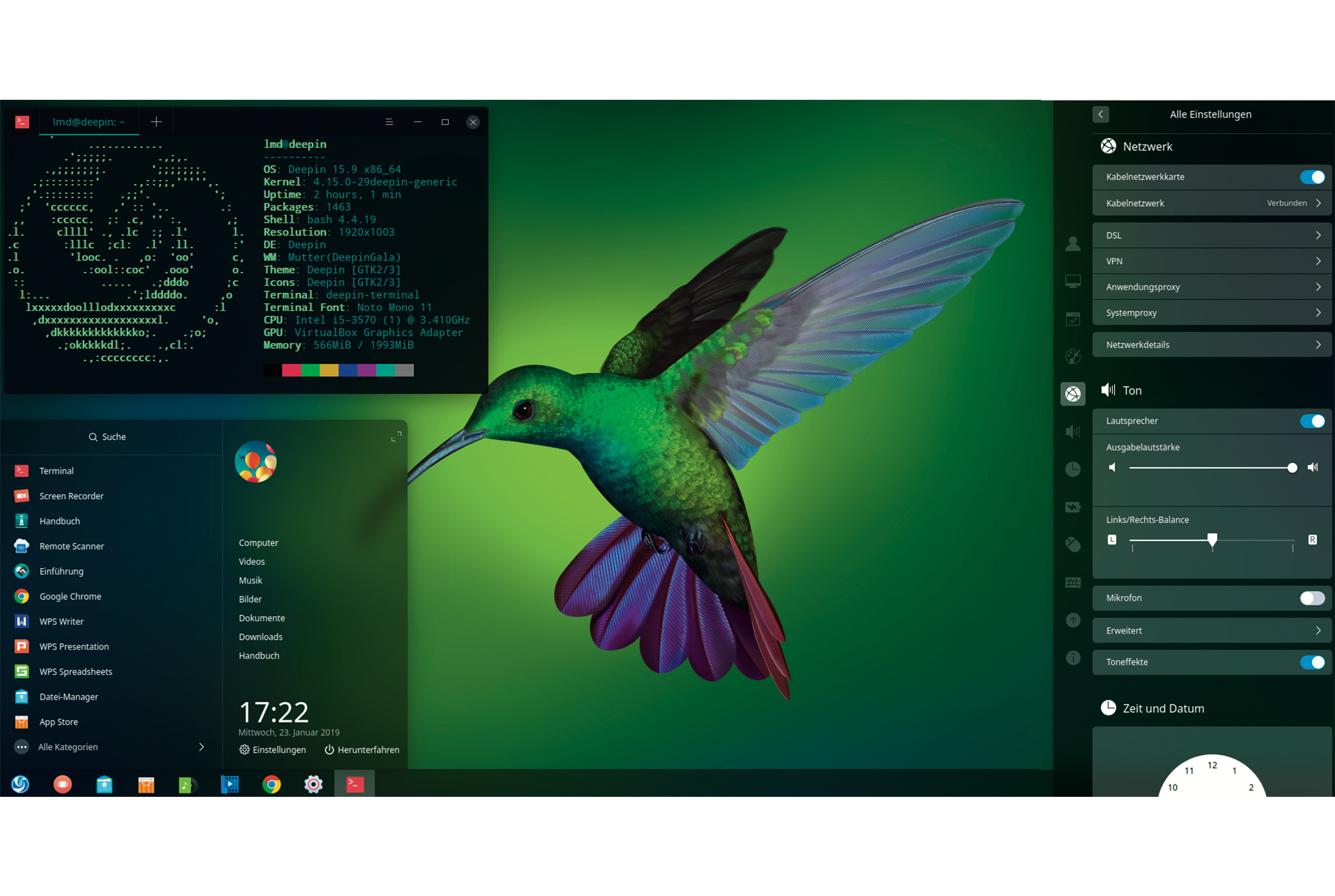 Deepin 15.9 ist mehr als nur ein weiteres Debian-Derivat: Die chinesische Linux-Distribution bringt nicht nur eine eigene Desktop-Umgebung, sondern auch viele eigene Tools mit. Ganz im Vordergrund stehen dabei die Bedürfnisse der Desktop-Anwender. Seit 2014 gibt es das System außer in Chinesisch auch in anderen Sprachen, darunter Deutsch und Englisch. Die Distributoren von Wuhan Deepin Technology bauen das System auf der Basis von Debian Unstable, nutzen aber eigene Paketquellen. Das Rolling Release verwendet den Paketmanager apt; unter der Haube arbeitet der Linux-Kernel 4.15.