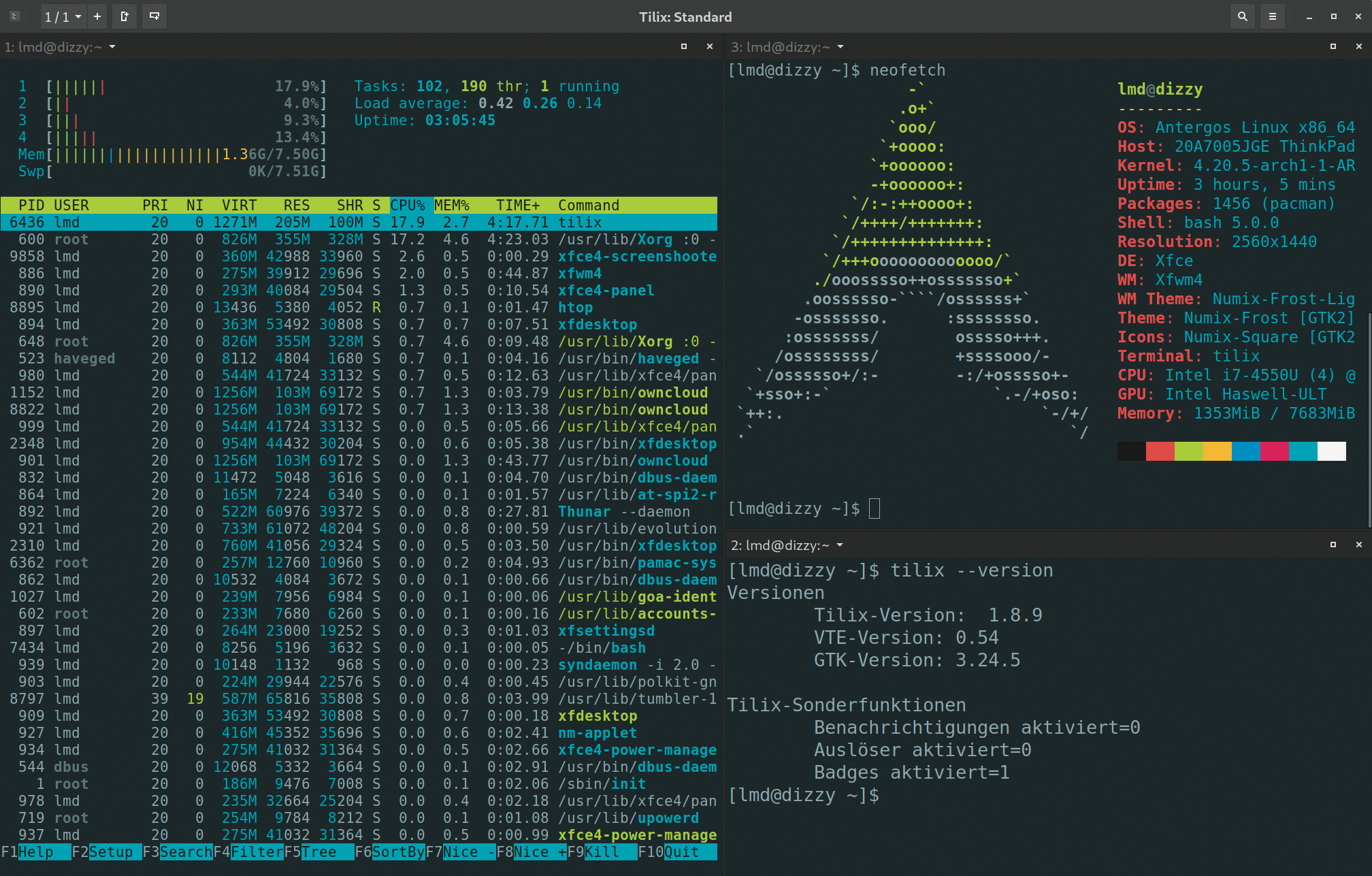 Das Linux-Programm Tilix erleichtert die Arbeit mit vielen parallel geöffneten Terminals, indem es sie in einem Fenster ganz nach Wunsch anordnet.