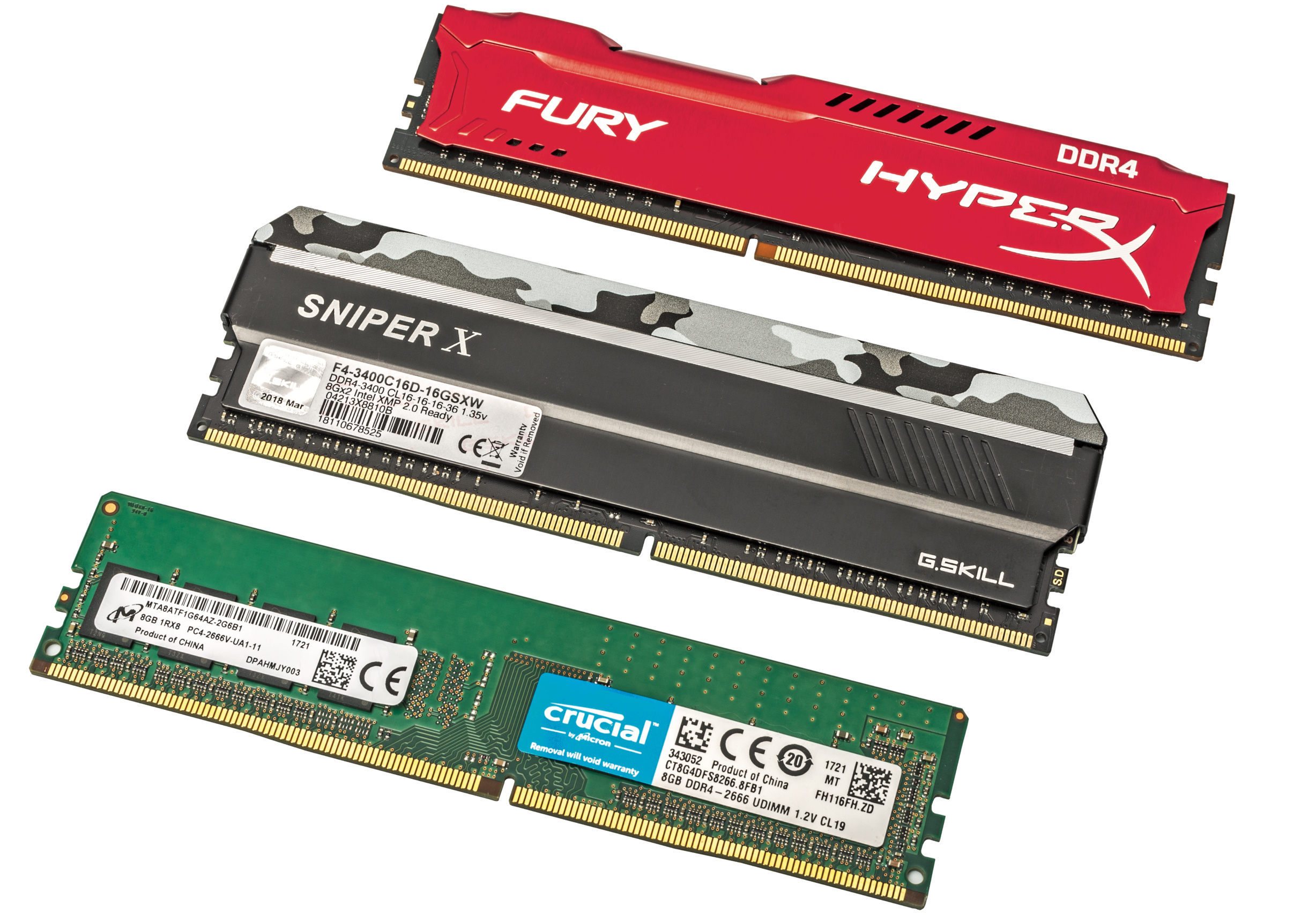 Arbeitsspeicher für moderne Desktop-PCs gibt es in diversen Geschmacksrichtungen zu kaufen: Für gängige Plattformen wie Ryzen und Ryzen Threadripper von AMD sowie Core i-8000/9000 und Core X von Intel stehen DDR4-Module mit einer Kapazität von 4, 8 oder 16 GByte und unterschiedlichem Tempo von DDR4-2133 bis hinauf zu DDR4-4800 zur Wahl.