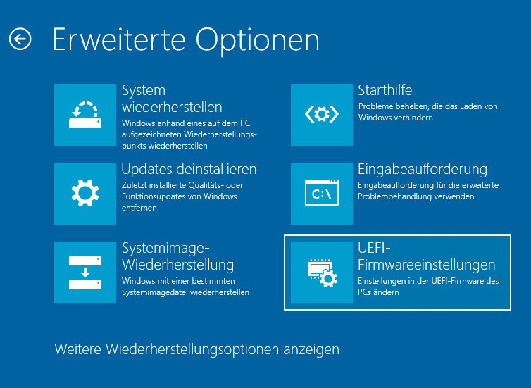 Bei manchen PCs scheitert dieser Boot-Weg jedoch an Fehlern im BIOS. Fahren Sie Windows dann erneut per Shift-Neustart herunter, um das BIOS dann via „Problembehandlung/Erweiterte Optionen/UEFI Firmwareeinstellung“ aufzufordern, beim nächsten Start das BIOS-Setup zu öffnen. Dort können Sie dann die Boot-Reihenfolge anpassen, wie Sie es von klassischen BIOSen kennen.
