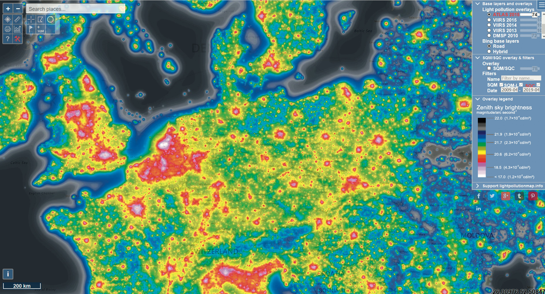 Dazu stehen auf der Grundlage einer interaktiven Karte von Bing Maps mehrere Overlays zur Verfügung: Der New World Atlas of Artificial Night Sky Brightness zeigt die Helligkeit des Himmels im Zenit, die Daten zweier NASA-Wettersatelliten-Programme die Lichtstrahlung am Boden. Letztere machen neben Siedlungen sogar stark befahrene Verkehrswege sichtbar. Zudem lassen sich spezifische Helligkeitsdaten für frei wählbare Punkte und Gebiete abfragen und damit beispielsweise Astrofotografie-Sessions planen. Wer ein passendes Messgerät (Sky Quality Meter, SQM) besitzt, kann außerdem eigene Messungen übermitteln und helfen, die Karte weiter zu verfeinern. (mon@ct.de)