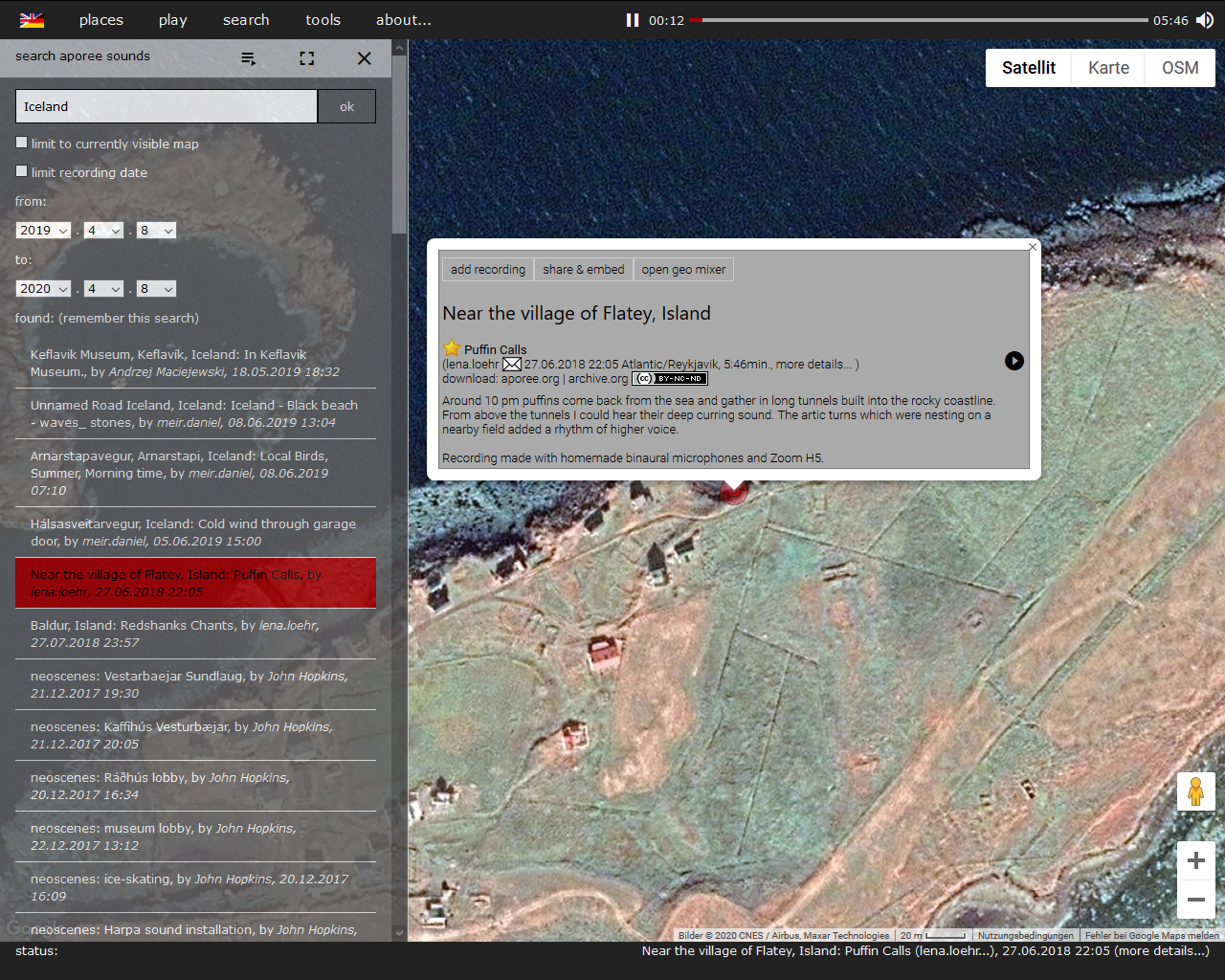 Flugzeuge bleiben am Boden und Fernreisen werden storniert, aber fürs Internet gelten glücklicherweise keine Reisebeschränkungen. Virtuell kann man weiterhin so ziemlich jeden Ort der Welt besuchen. Während öffentliche Webcams, 360-Grad-Panoramen und Multimediaberichte vor allem spannende Bilder liefern, sammelt radio aporee maps Geräusche aus aller Welt. Fast 50.000 Audiodateien von mehr als 44.000 Orten hat der Netzkünstler Udo Noll bisher für sein Projekt zusammengetragen. Insgesamt hat das Material eine Länge von rund 137 Tagen, denn die einzelnen Aufnahmen sind im Schnitt knapp 4 Minuten lang. Besucher erhalten so nicht bloß einen flüchtigen akustischen Eindruck, sondern können sich in aller Ruhe in die Geräuschkulisse hineinhören.