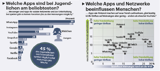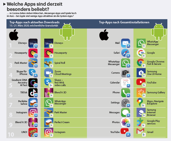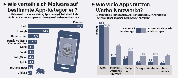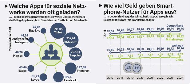 In Deutschland geben Nutzer im internationalen Vergleich pro Jahr besonders viel für Smartphone-Apps aus, nämlich knapp 20 Euro. In Corona-Zeiten haben Apps zum Chatten und für die Videotelefonie Konjunktur, aber auch Spiele. Dass dafür viel ausgegeben wird, spiegelt sich in der Statistik der Kauf-Apps nur unzureichend wider, denn sie umfasst nicht die bei Spielen üblichen In-App-Käufe. Anders als man vermuten könnte, sind Spiele nicht der Hauptträger von Malware, sondern vorgeblich nützliche Tools. Einigen Social-Media-Apps schreibt man besonders viel Einfluss bei der Entdeckung neuer Trends zu, anderen wiederum eher bei der Meinungsbildung. Bei der ohnehin großen Zahl der Apps, die Programmcode von Werbedienstleistern verwenden, ist die starke Konzentration auf wenige Anbieter außer Google selbst auffällig. Bei den Apps für soziale Netzwerke fällt auf, dass Tiktok wächst, und dass auch Apps zum Pimpen von Instagram offenbar eine größere Rolle spielen. (mil@ct.de)
