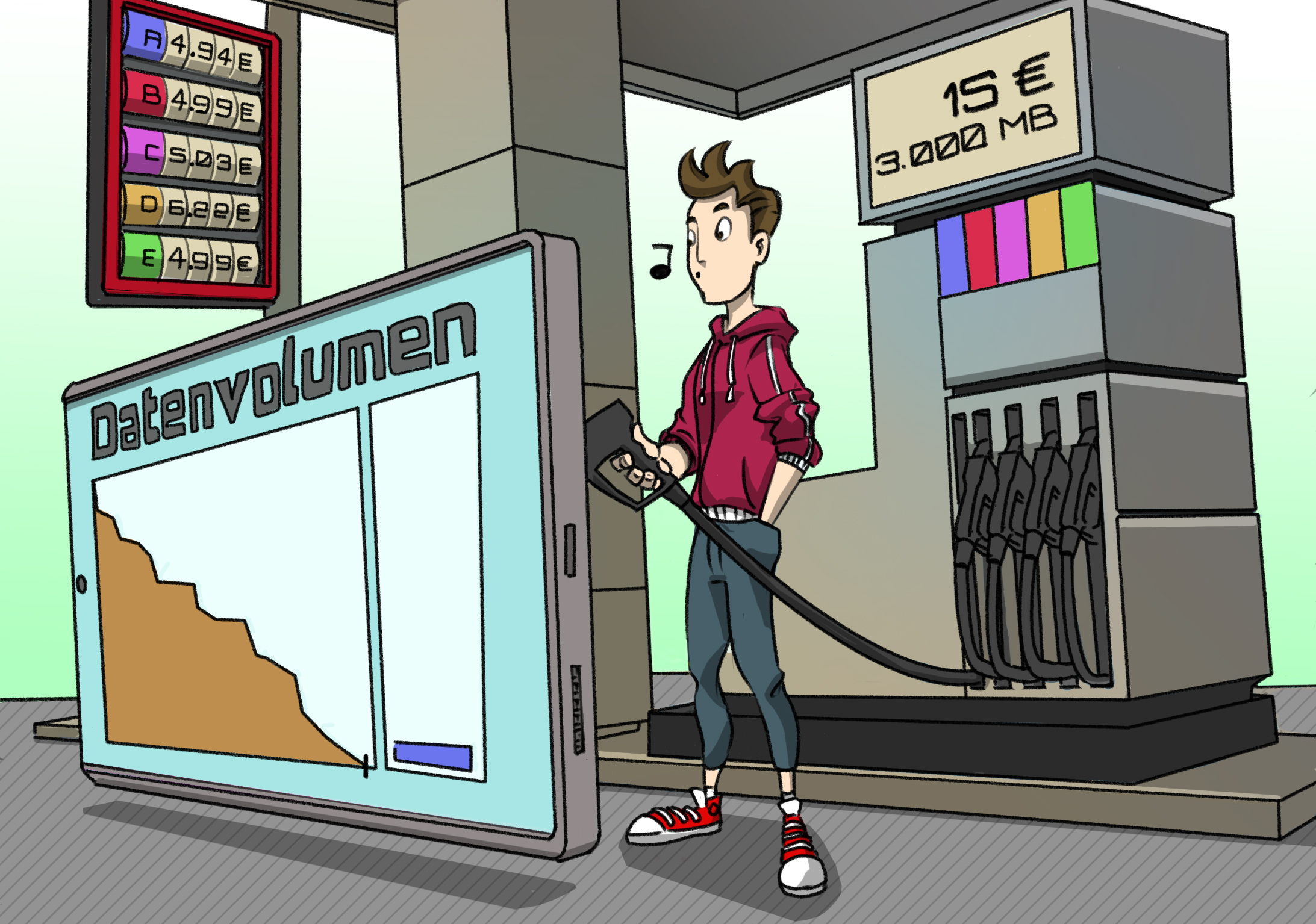 Bei allem Respekt für die Telekom-Anbieter: Für mich sind das trotzdem Anbieter von Pferdewetten, welche es sich auf ihrer Rennbahn so richtig gemütlich eingerichtet haben. Nach anscheinend gottgegebenen 28 Tagen verfällt bei exakt allen Anbietern das bezahlte Paket, unabhängig von den bezogenen Leistungen. Das ist etwa so, als wenn der freundliche Tankwart im Cartoon des Artikels monatlich bei mir vorbeikommt und bei meinem Auto alles noch vorhandene Benzin aus dem Tank absaugt.