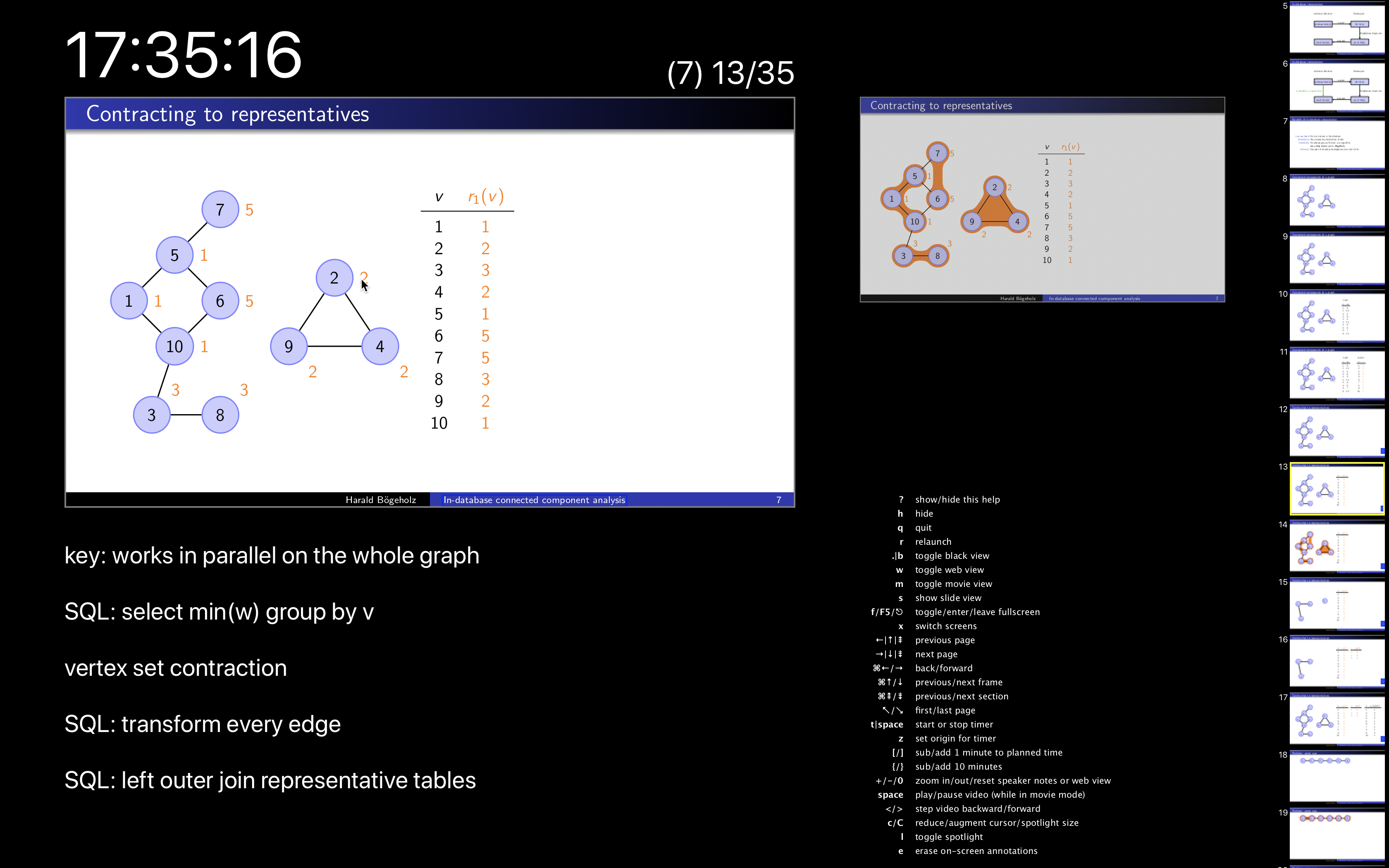 Présentation für macOS hilft beim Präsentieren solcher Folien, indem es in einem zweiten Fenster eine Sprecheransicht anzeigt. Dort sieht man groß die aktuelle Folie, kleiner eine Vorschau auf die nächste und noch kleiner eine Übersicht über den gesamten Vortrag, außerdem die Uhrzeit oder einen Timer. Wer seine Folien mit Beamer erstellt, kann mit einem einfachen Kommando Notizen integrieren, die in der Sprecheransicht unter der aktuellen Folie erscheinen.