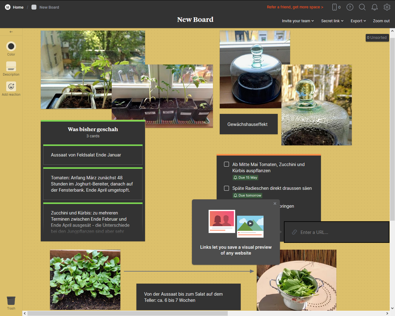 Links neben der Arbeitsfläche befindet sich eine Leiste mit Platzhaltern. Als Erstes zieht man ein sogenanntes Board in den Arbeitsbereich. Darauf lassen sich nun Notizen, Textkästen, To-do-Listen, Bilder, Dokumente und URLs arrangieren, außerdem Kommentare und Verbindungslinien.
