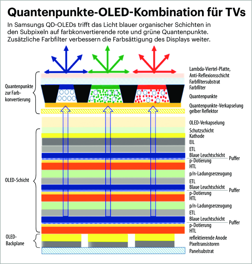 Samsung will nach sieben Jahren wieder auf organische Displays setzen, diesmal in Kombination mit Quantenpunkten: Eine blau leuchtende organische Schicht soll das LED-Backlight ersetzen und die Quantenpunkte das blaue Licht direkt in den Subpixeln ins Grüne und Rote konvertieren (blaue Subpixel leuchten direkt).