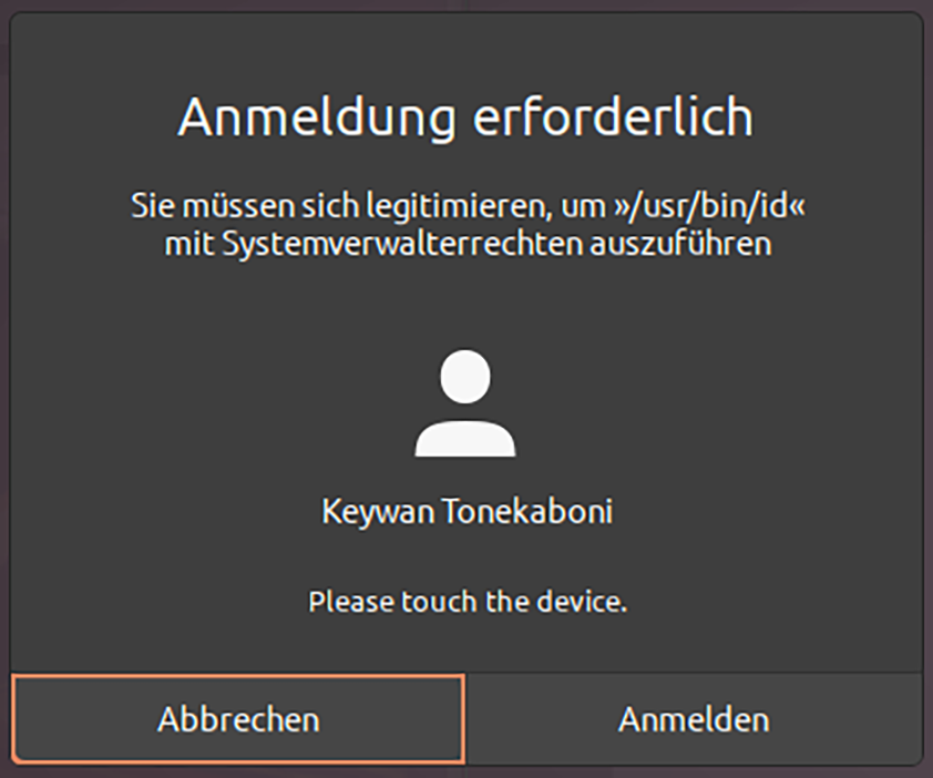 Fordert PAM eine Authentifizierung über das U2F-Modul an, wird der Text „Please touch the device“ angezeigt. Das klappte bei uns unter Ubuntu 20.04 sowohl im Terminal (sudo -k id) als auch bei grafischen Dialogen. Letztere können Sie mit pkexec id testen. (ktn@ct.de)