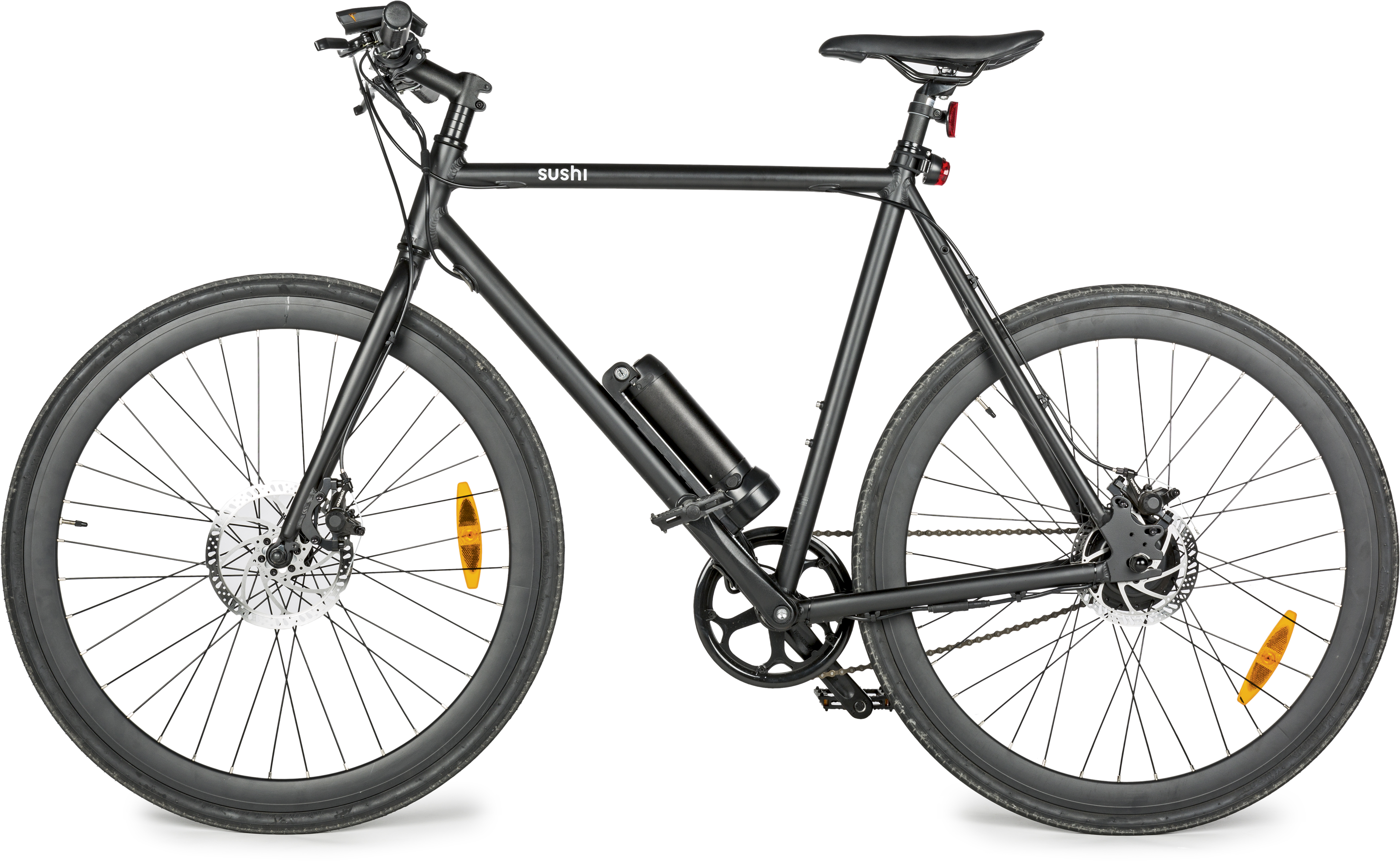 Sushi Bikes verlangt für sein E-Bike einen Preis von 999 Euro. Das ist auf einem Niveau mit den – häufig zu Recht – als minderwertig angesehenen „Baumarkt-E-Bikes“. Sushi erreicht den geringen Preis aber nicht durch billige Komponenten, sondern durch ein simples Design und das Weglassen von Komfortmerkmalen wie Gepäckträger, Schutzblechen, Ständer und Gangschaltung. Der Rahmen besteht aus einfachen Alu-Rundrohren, Federung gibt es weder vorne noch hinten. Die 28-Zoll-Reifen von Kenda sitzen auf Tiefbett-Felgen, die Scheibenbremsen kommen von Tektra, der Akku von Samsung. Griffe mit Echtleder runden den guten ersten Eindruck ab.
