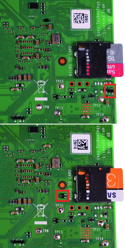 Auf der Platine selbst können Sie schauen, ob sich direkt neben dem Wort „MICRO“ der Beschriftung des Micro-SD-Kartenschachts ein kleiner dreibeiniger Transistor befindet. Nur die korrigierten Boards der Revision 1.2 haben den Transistor an dieser Position.