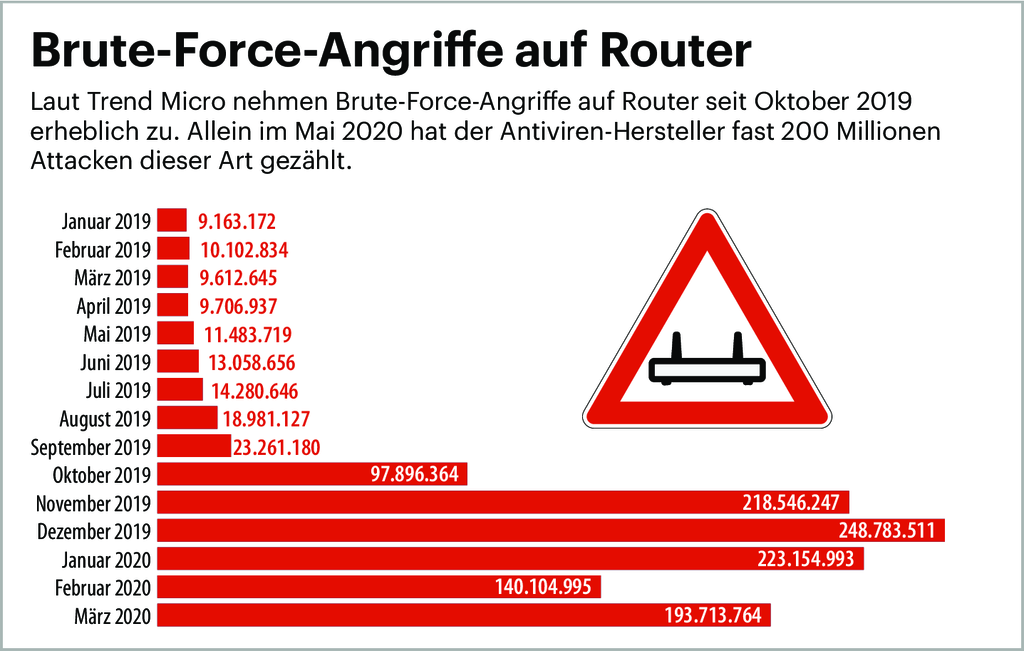 Aktuell greifen Kriminelle viel mehr Home-Router an als je zuvor, wie aus einer Studie des Antiviren-Herstellers Trend Micro hervorgeht. Zwischen September und Dezember 2019 hat sich die Zahl fast verzehnfacht, nämlich von 23 auf 249 Millionen unberechtigte Login-Versuche. Allein im März dieses Jahres registrierte das Unternehmen fast 194 Millionen solcher Angriffe. Die Sicherheitsforscher gehen davon aus, dass mit der Verlagerung von Firmendaten in Heimnetzwerke solche Attacken für Kriminelle weit lukrativer werden.