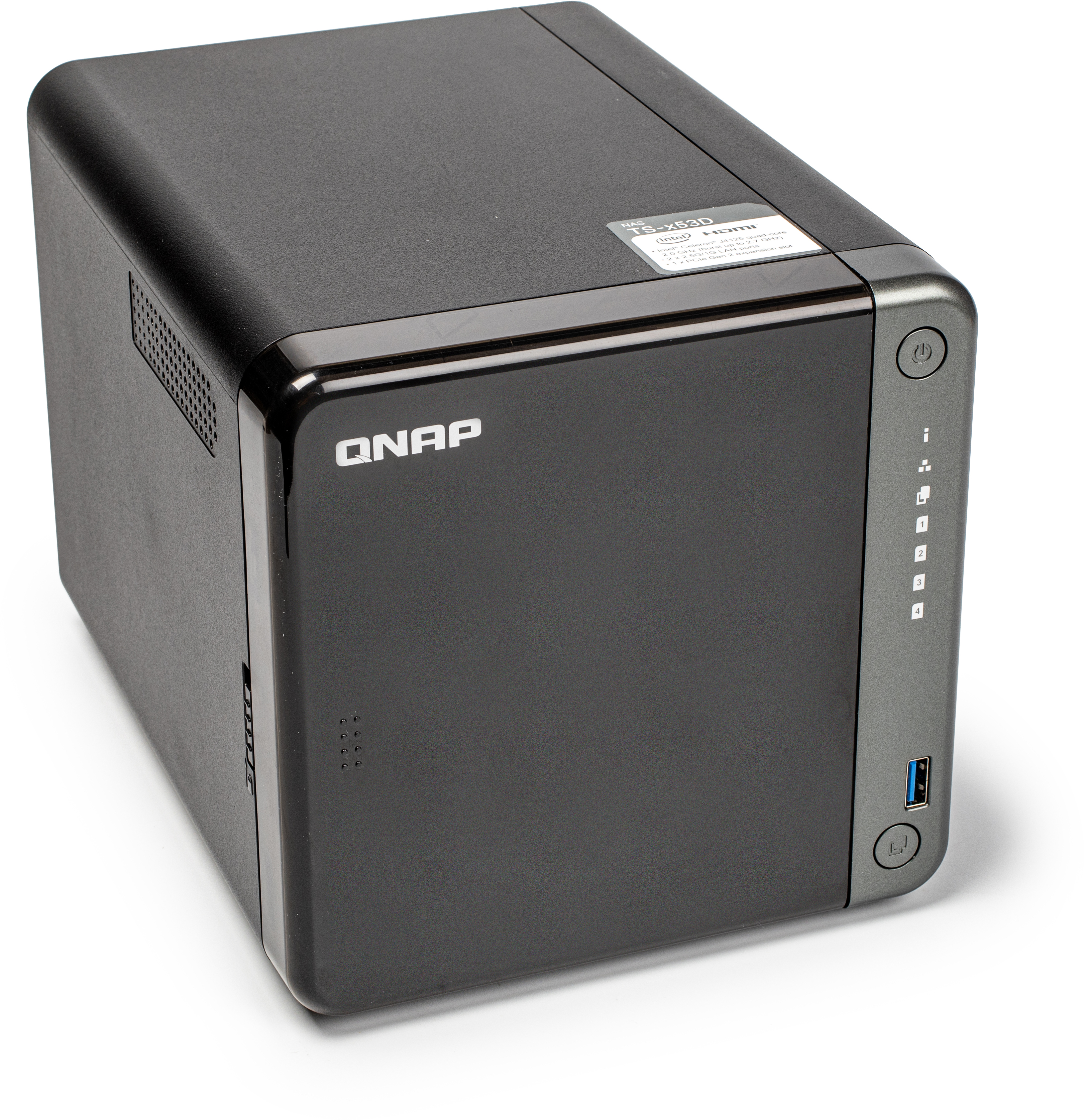 Das TS-453D ist die 4-Bay-Variante des in c’t 15/2020 getesteten Modells TS-253D mit zwei Plattenschächten. Wie dieses hat das 453er ab Werk zwei Multigigabit-Ethernet-Ports (NBase-T), die bis zu 2,5 GBit/s erreichen (netto knapp 300 MByte/s). Mit SSDs bestückt liefert das 4-Bay-NAS mehr Durchsatz, als diese Ports weitergeben können. Damit wird die nachrüstbare NBase-T-Karte QNAP QXG-10G1T attraktiv, die im LAN mit bis zu 10 GBit/s arbeitet.