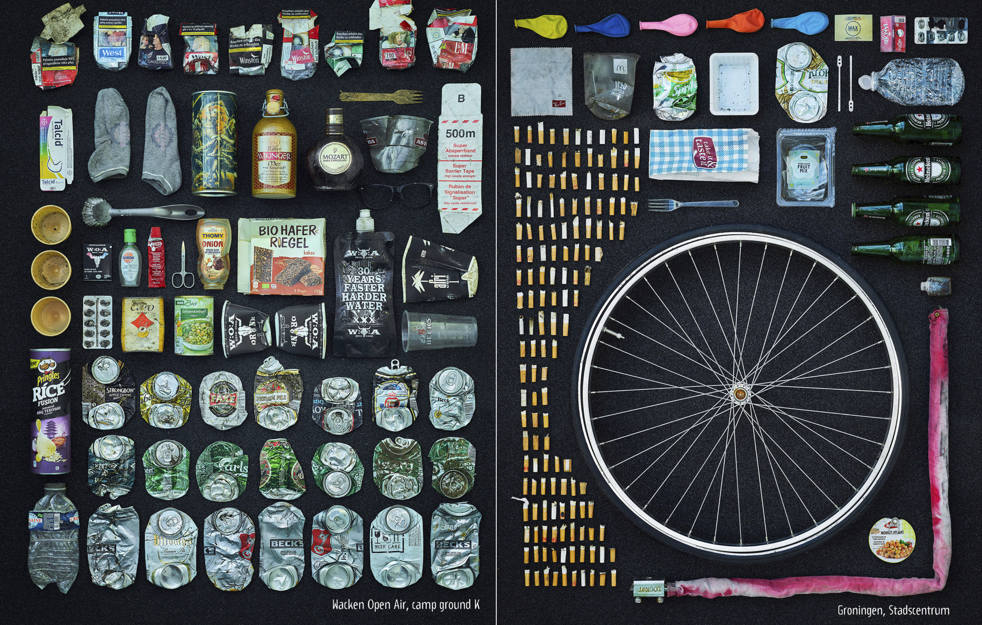 Knolling nennt man eine besondere Form des Stilllebens, für die Objekte der Größe nach sortiert und gerade ausgerichtet nebeneinander liegend dargestellt werden – meistens als Fotografie. Bekannt wurde das Knolling, das derzeit auf Instagram und Pinterest ein Trend ist, auch durch den Schweizer Ursus Wehrli und seine Bestseller-Bilderbücher mit dem Titel „Kunst aufräumen“. Der Fotograf Simon Puschmann hat Müll gesammelt und in der Knolling-Fotoserie Wastelands festgehalten. Jede Menge Kronkorken und Kippen vom Isarufer, „Jupiter“-Bierdosen und Zigarettenschachteln aus Brüssel – alles hat er fein säuberlich arrangiert.