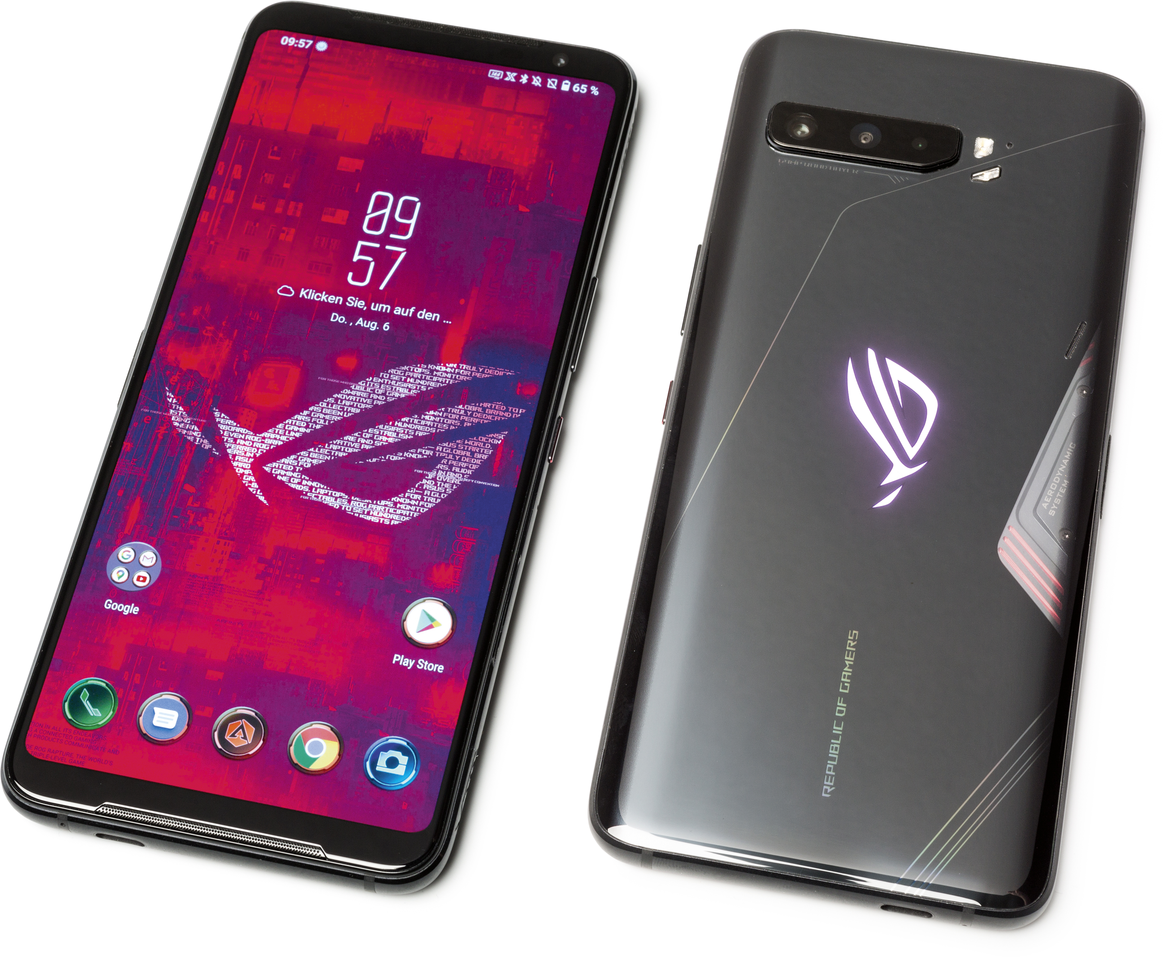 Den Anspruch, ein Gaming-Smartphone zu sein, unterstreicht das Asus Rog Phone 3 schon mit seinem markanten Äußeren samt LED-Logo auf der Rückseite. Im Gehäuserahmen sitzt seitlich ein zweiter USB-C-Port, der auch Displaysignale ausgibt. So kann man das Smartphone komfortabel während des Spielens im Querformat laden. Im Gehäuserahmen sitzen außerdem zwei berührungsempfindliche Flächen, von Asus Air Trigger genannt, die als Schultertasten fungieren. Wischen und Drücken lösen in Spielen unterschiedliche Aktionen aus.