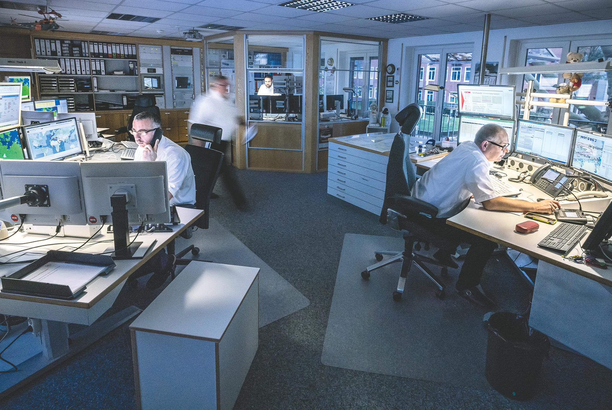 Der Funkanruf klingelt. Der Wachleiter in der Seenotleitung nimmt an. Sein Gesicht bleibt entspannt: Die Besatzung des Seenotrettungskreuzers „Vormann Jantzen“ hat einen Kranken von Norderney zum Festland gebracht und meldet sich nun zurück. Der Wachleiter und der Vormann des Kreuzers, wie der Kapitän hier heißt, besprechen kurz den Einsatz. „Irgendwelche Probleme?“ Keine. Man kennt sich, der Ton ist herzlich. Nachdem er das Gespräch beendet hat, schließt er im Einsatzleitsystem auf seinem Bildschirm den „Fall“, wie es im Jargon nüchtern heißt. Das Symbol für die „Jantzen“ schiebt er mit der Maus zurück auf den Bildschirm, der die einsatzbereiten Seenotrettungskreuzer und -boote anzeigt.