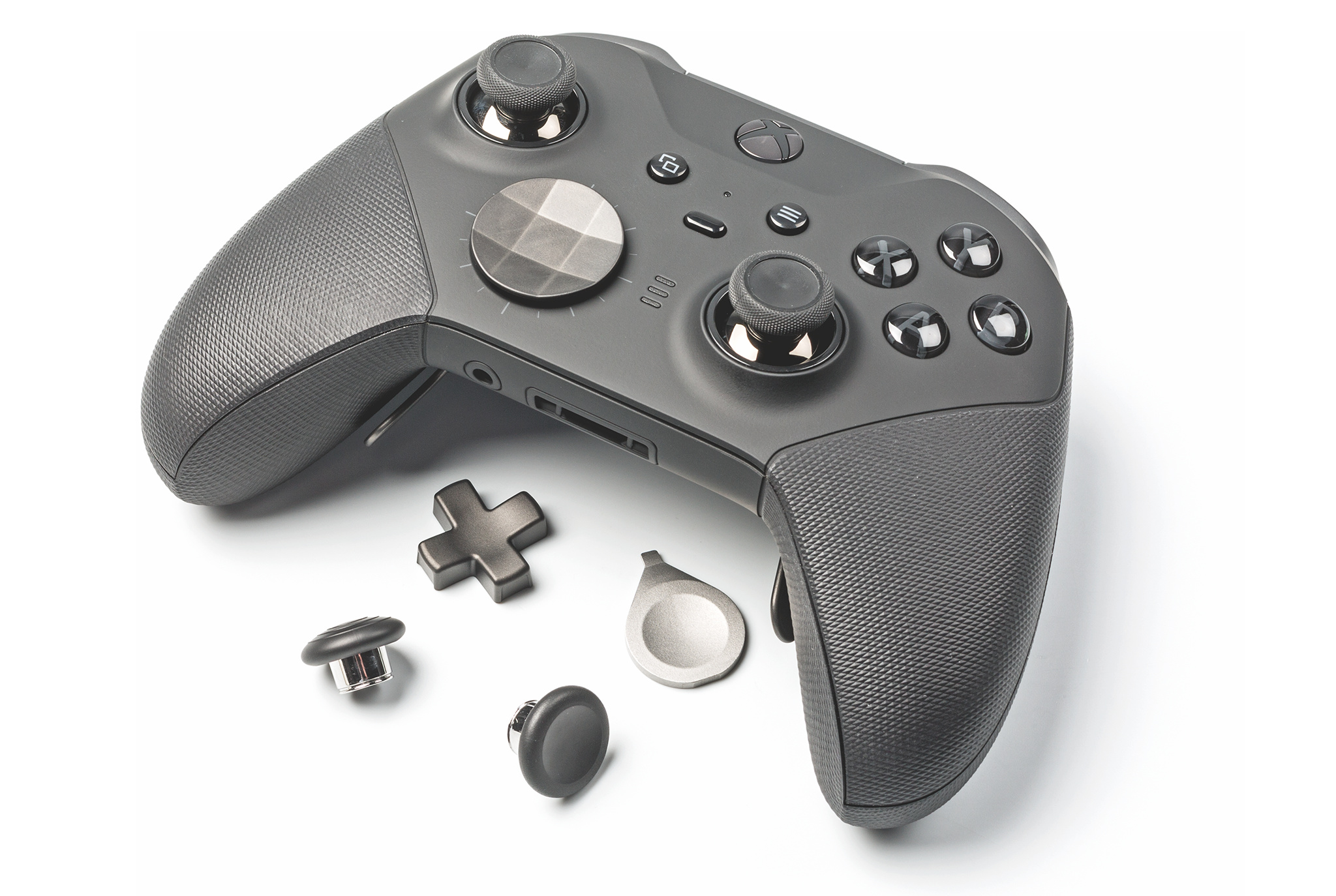 Verbessert hat Microsoft die zusätzlichen Paddel an der Unterseite des Gamepads, die zackiger anspringen und robuster sitzen. Das Steuerkreuz und die beiden Thumbsticks lassen sich austauschen: Dem Controller liegen Alternativ-Sticks bei, darunter einer mit längerem Stiel und einer mit nach außen gewölbter Kuppel.