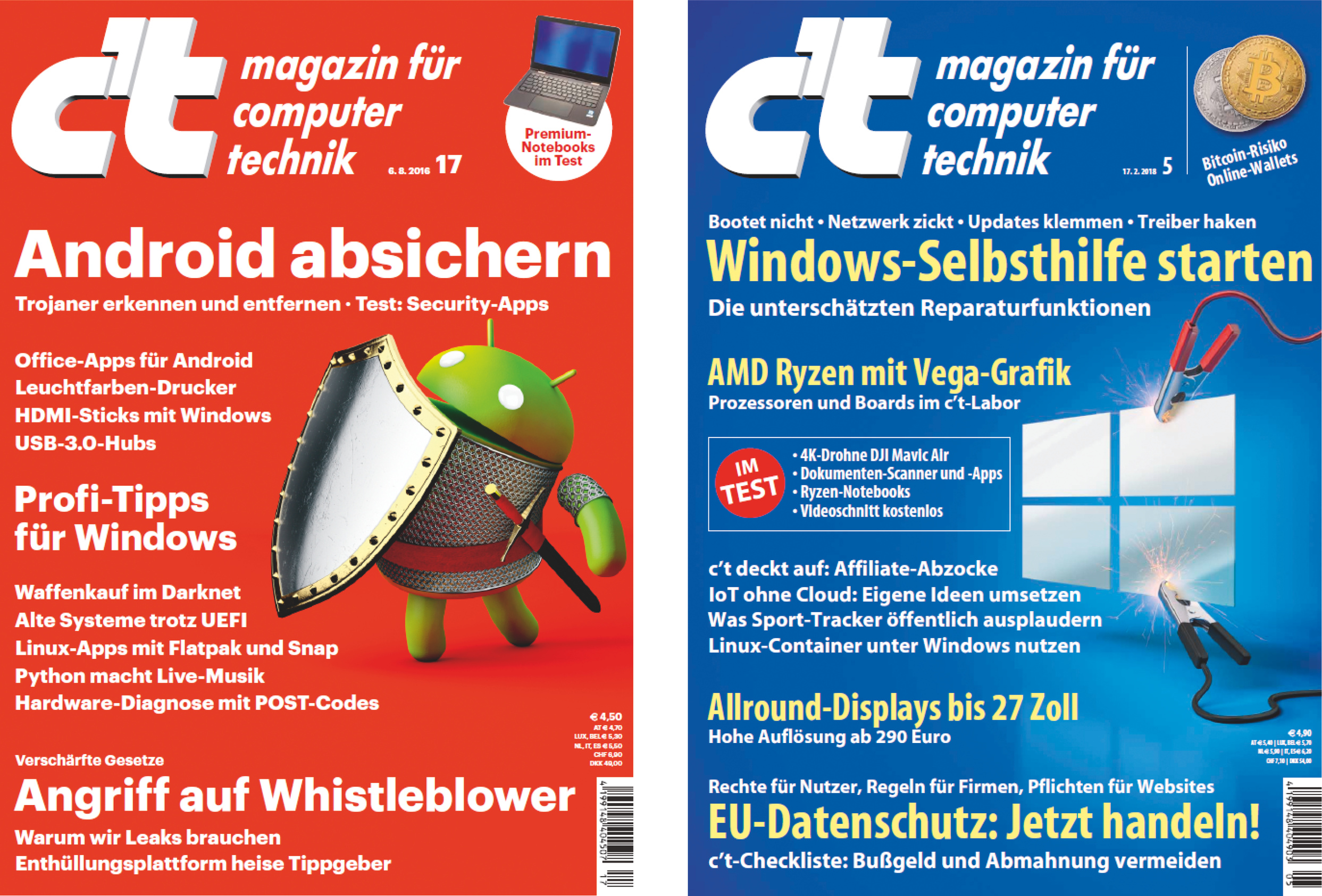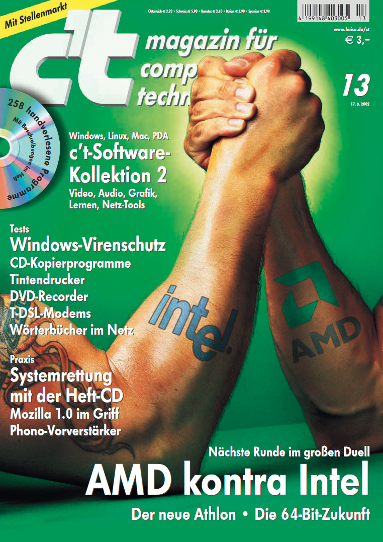 Die Entwicklung der Prozessoren zu beobachten und zu kommentieren gehörte von Anfang an zum Kerngeschäft der c’t. Auf der 16/1999 wird AMDs K7 (Athlon) als „Pentium-III-Killer“ bezeichnet. Auf der 24/2000 heißt es „Intel schlägt zurück – Pentium 4 gegen den Athlon“. Mit jeder neuen Prozessorgeneration ging der Ringkampf in eine neue Runde – der Titel der 13/2002 setzt das Thema vielleicht am schönsten in Szene.