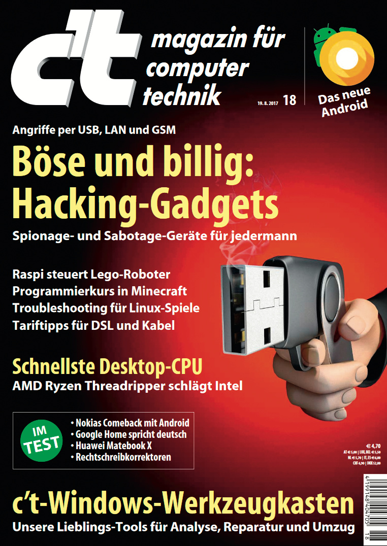 Seit Ende 2016 kümmert sich unsere Artdirektorin Nicole Judith Höhne – zusammen mit der gesamten Layoutabteilung – darum, dass aus den Manuskripten der c’t-Redakteure ansehnlich bebilderte Artikel werden. Ihre Lieblings-Titelproduktion ist die von Heft 18/2017 mit dem Titel „Böse und billig: Hacking-Gadgets“. Sie erinnert die Vorbesprechung des Titelmotivs gut, bei der alles so schnell ging: „Da kam der sehr große Kollege Ronald Eikenberg in mein Büro. Er hatte ein sehr kleines Gadget in der Hand, einen USB-Stick. Den hatte er so eingeklappt, dass ich unvermittelt dachte: Das ist doch eine Pistole. Da das Motiv auch inhaltlich trug, war die zumindest nach meiner Zeitrechnung bei c’t wohl schnellste Titelidee geboren – quasi wie aus der Pistole geschossen.“