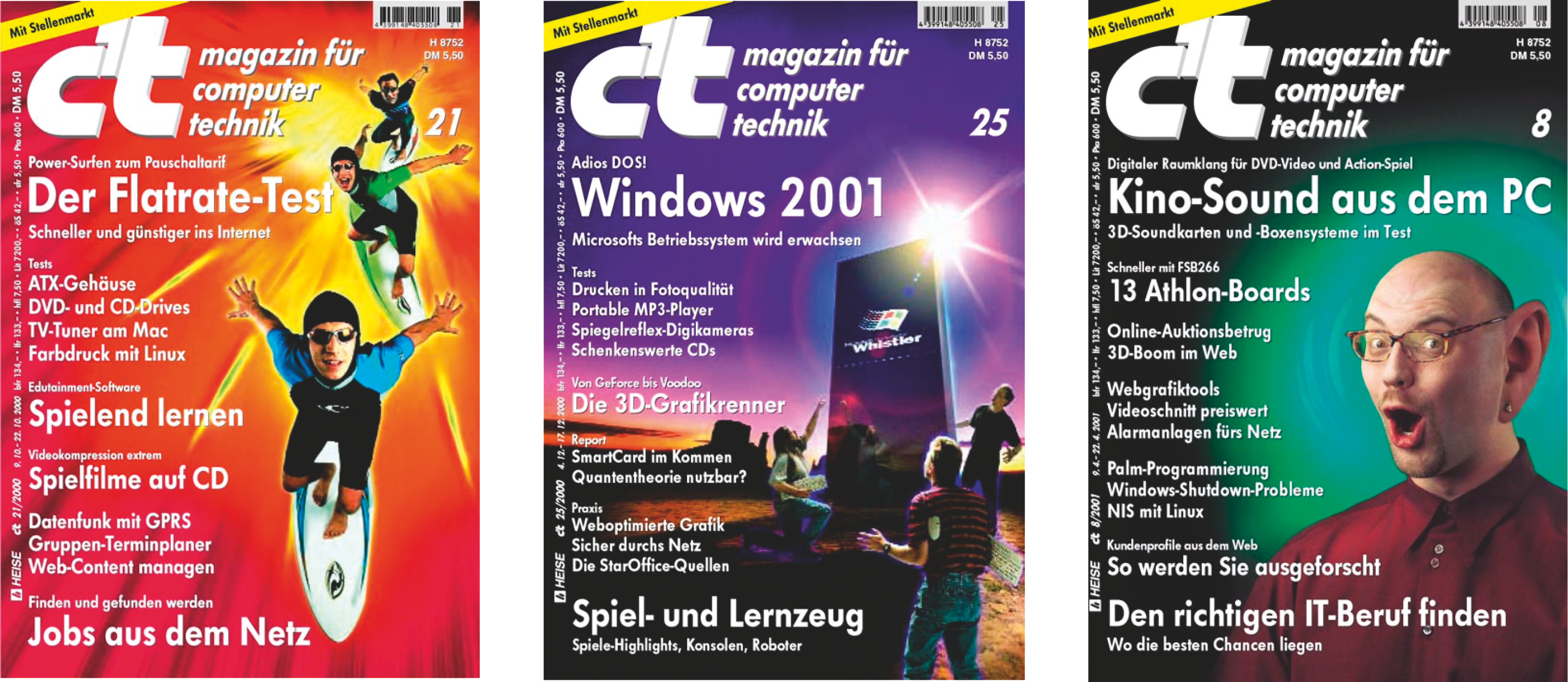 Ersttitel der 25/2001 war „Windows 2001“. Drei Menschen huldigen auf diesem Cover einer Art Hochglanz-Stele, die mit dem Code-Namen der damals neuen Windows-Version, „Whistler“, beschriftet ist. In der Bildmitte sieht man Hans-Jürgen Bernd, den ersten und lange Zeit einzigen technischen Assistenten der c’t. Intern ist dieser Kollege übrigens unsere „Nummer 1“ – in den Unterlagen der Personalabteilung der Heise Medien GmbH wird er nämlich als erster c’t-Mitarbeiter geführt.