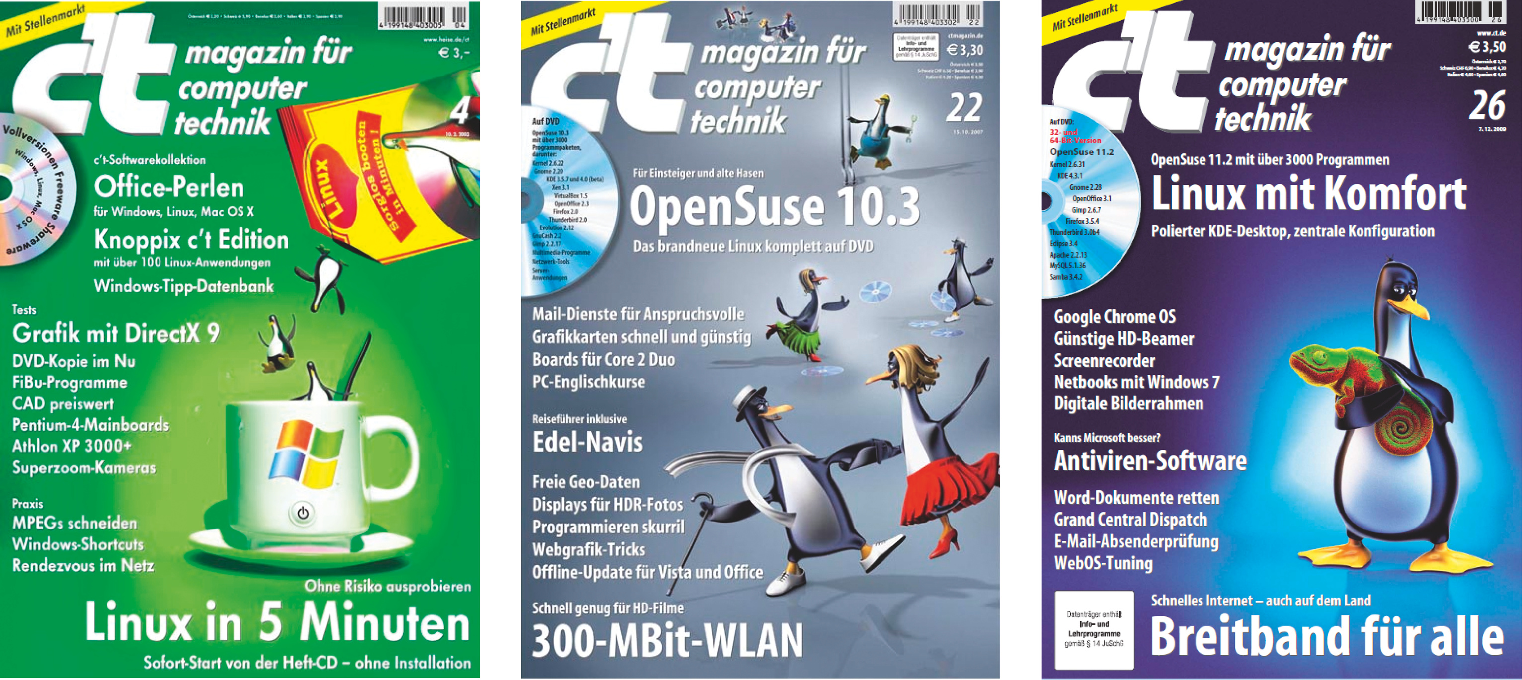 Unser langjähriger Artdirektor Thomas Saur erfand die gerenderte c’t-Variante des Linux-Pinguins: Deutlich schlanker und smarter als der typische Plüsch-Tux und unglaublich wandlungsfähig. So purzeln auf c’t 4/2003 ein paar Exemplare aus einer Tütensuppentüte mit der Aufschrift „Sorglos booten in Minuten“ – eines der Lieblingstitelmotive unseres amtierenden Chefredakteurs Dr. Jürgen Rink.