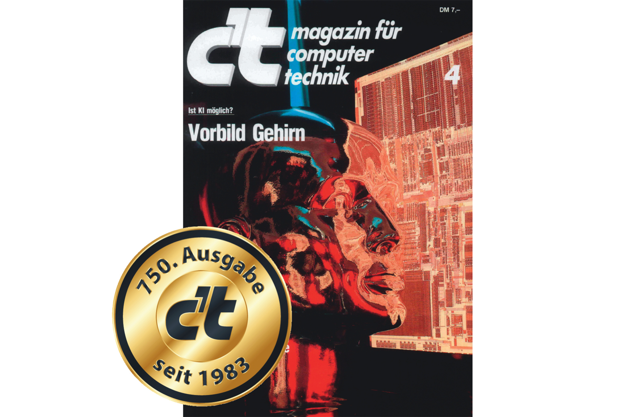 In den ersten Jahren der c’t ging es noch recht geruhsam zu. Es gab jeden Monat eine Ausgabe und so hatte die Redaktion satte vier Wochen Zeit, um an einem Heft zu arbeiten. Und schon in den ersten Jahren befasste sie sich mit dem Thema künstliche Intelligenz. „Vorbild Gehirn“ lautet der Ersttitel der Ausgabe 4/1987 zu diesem Thema. Das Bild dazu ist dem c’t-Mitbegründer und jetzigen Herausgeber Christian Persson, von 1983 bis 2013 Chefredakteur der c’t, in bester Erinnerung: „Das Bild zu unserer ersten KI-Titelstory fand ich besonders gelungen. Ein Kopf mit Schaltsymbolen. Das war für die damalige Zeit herausragend – fotografiert, ganz ohne Photoshop.“