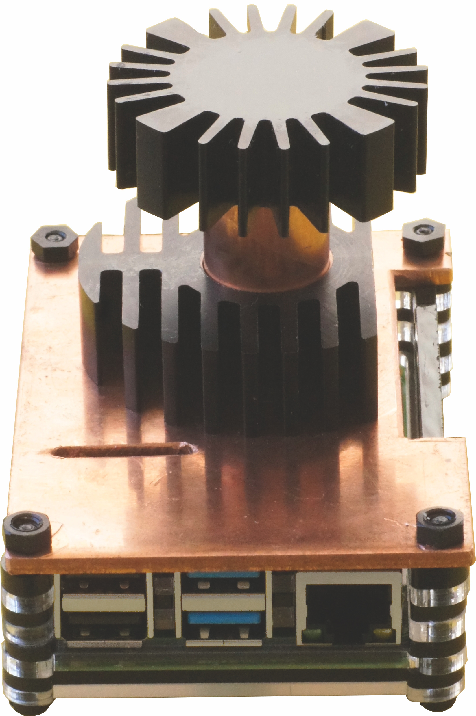 Leider fehlt das Argon ONE Case. Die Gehäuseoberseite dient als passiver Kühlkörper, zusätzlich ist ein Lüfter eingebaut, die Lüfterdrehzahl kann konfiguriert werden. Die GPIO-Pins bleiben alle erreichbar, zusätzlich sind alle Anschlüsse von einer Seite erreichbar. Etwas teurer, aber für das Gebotene absolut in Ordnung.