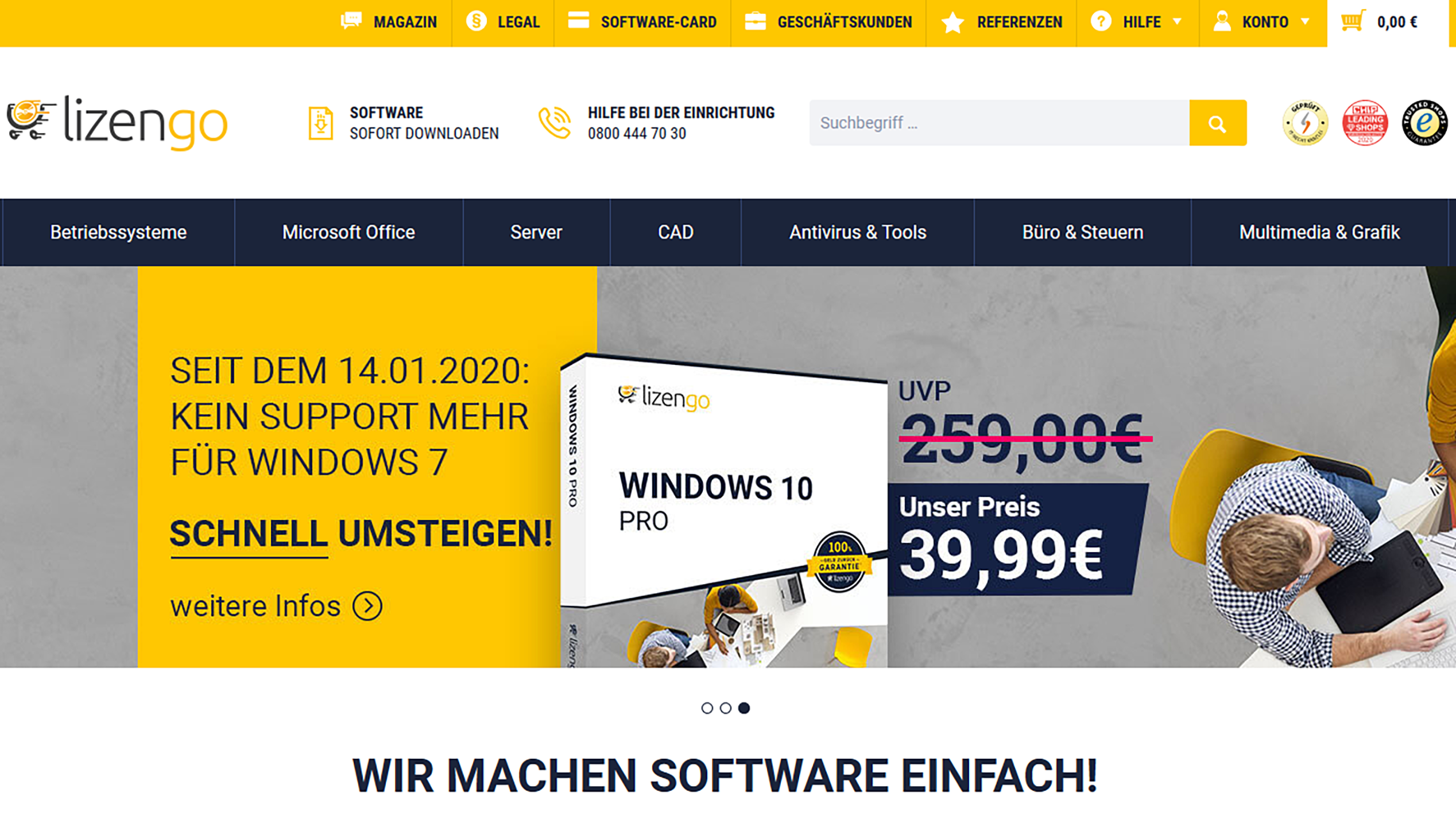 Über das Geschäftsmodell von Lizengo hatte c’t zuerst Mitte 2019 berichtet: Wie einige andere Lizenzhändler auch vertreibt das Unternehmen unter anderem Aktivierungsschlüssel für Microsoft-Software wie Windows oder Office weit unter den Verkaufspreisen des Herstellers. So kostet bei Lizengo beispielsweise Windows 10 Pro derzeit knapp 40 Euro, im Online-Shop von Microsoft schlägt dieselbe Version mit 259 Euro zu Buche.