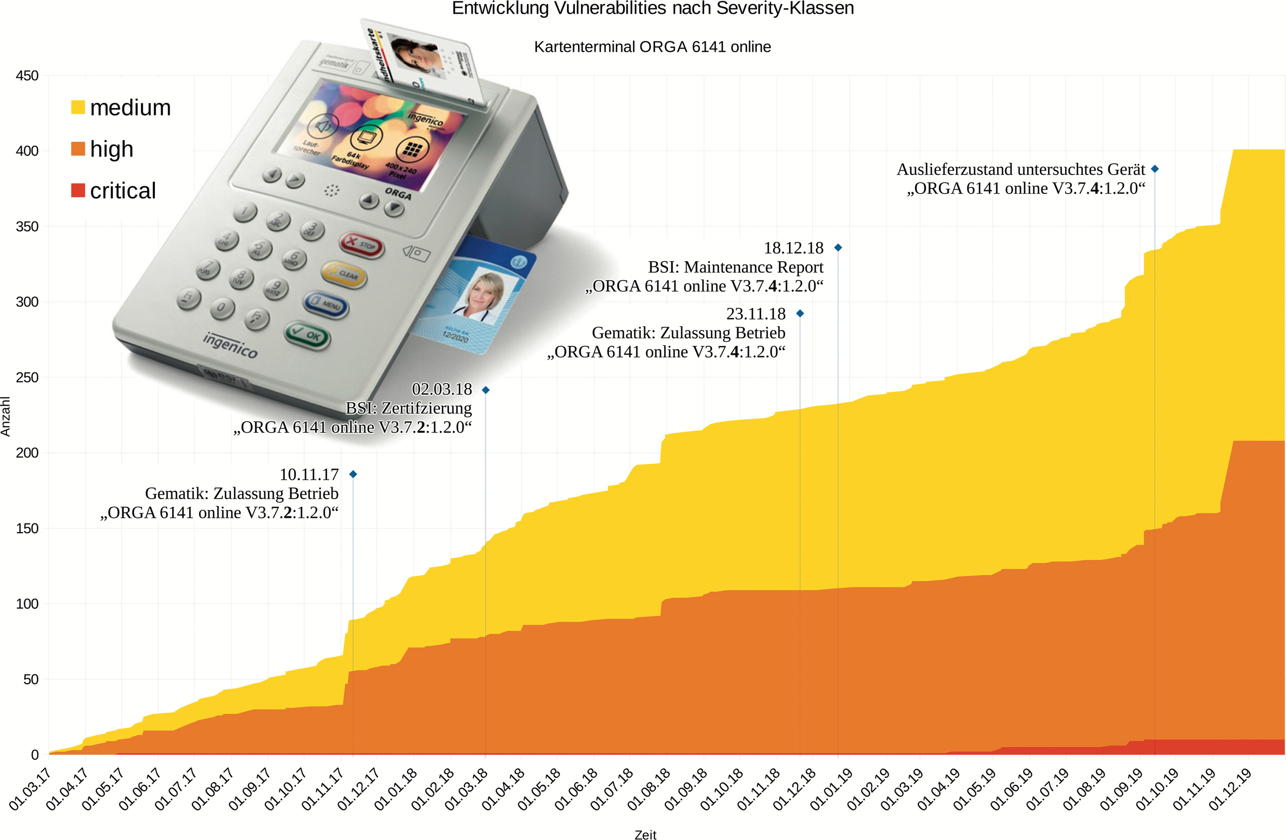 In der Grafik auf Seite 17 sind analog zum T-Systems-Konnektor mögliche Verwundbarkeiten des derzeit am weitesten verbreiteten Kartenterminals Ingenico ORGA 6141 online im zeitlichen Verlauf aufgezeichnet. Mit über hundert mittleren bis hohen sowie weiteren kritischen CVE-Einträgen, die sich seit der letzten Aktualisierung eingeschlichen haben, ist es zweifelhaft, dass das Kartenterminal ein „europaweit einzigartiges Sicherheitsniveau“ erreicht, von dem Gesundheitsministerium und gematik schwärmen.