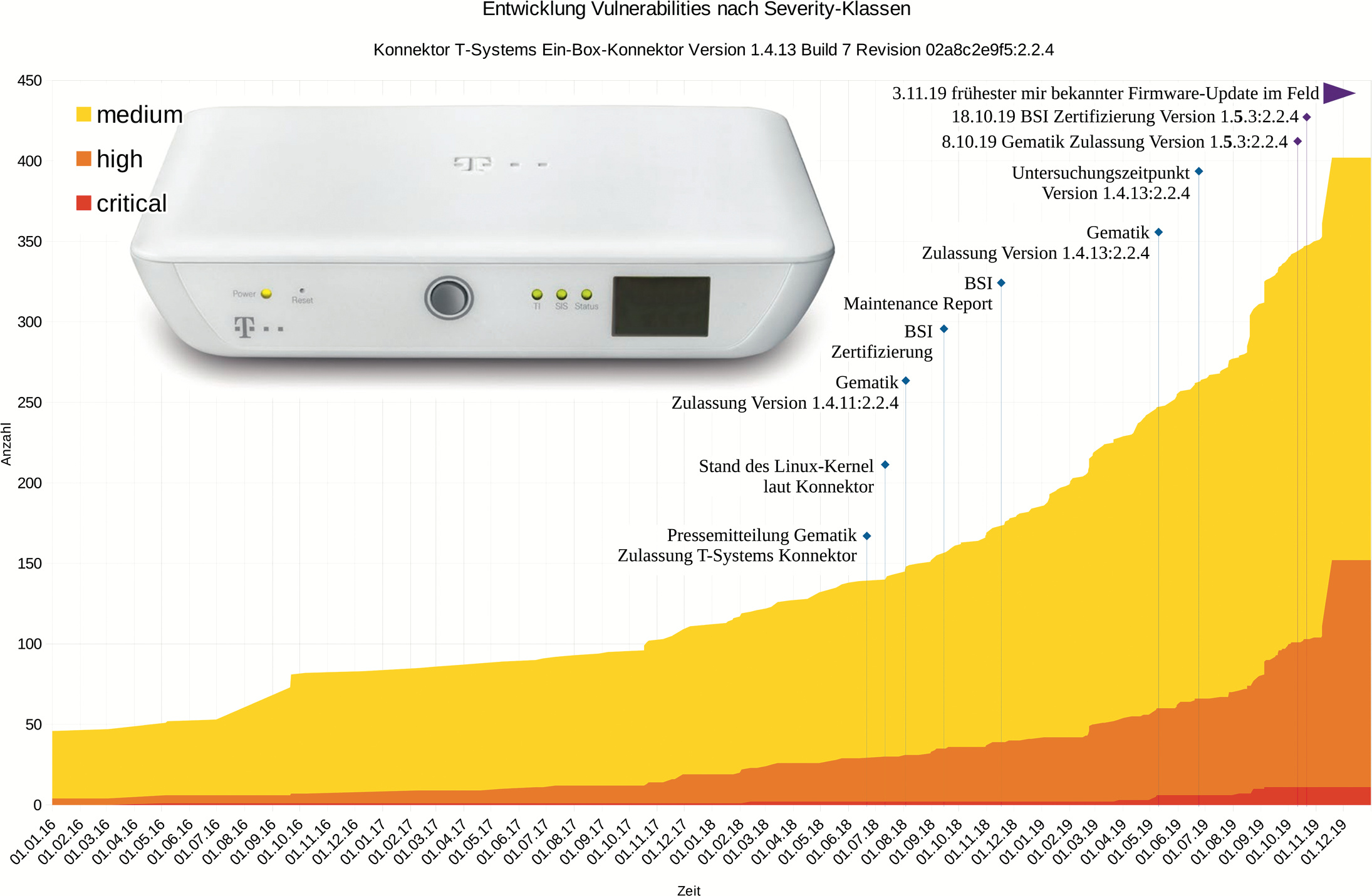 Filtert man noch alle Low-Einstufungen heraus (worüber man streiten kann), so verbleiben im T-Systems-Konnektor (Firmware 1.4.13) Hinweise auf mindestens 402 potenzielle Verwundbarkeiten: 11 kritische, 141 hochbrisante, 250 mittelbrisante (Stand 31.12.2019).