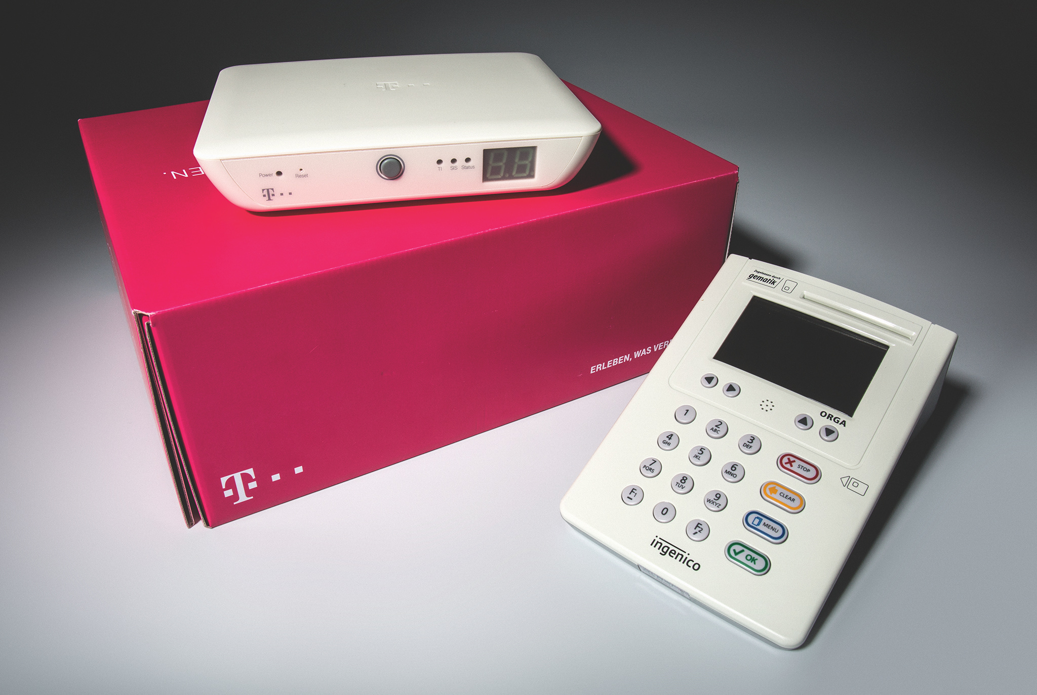 Neben dem Konnektor ist auch das Kartenterminal sicherheitskritisch. Nicht umsonst kleben auf dem Gehäuse diverse Sicherheitssiegel des BSI, die ein unbemerktes Öffnen verhindern sollen. Ein solches Terminal ist über das Praxis-LAN mit dem Konnektor verbunden und wacht über die Verwendung der digitalen Patienten- und Arzt-Identitäten sowie über den Zugriff auf Patientendaten.