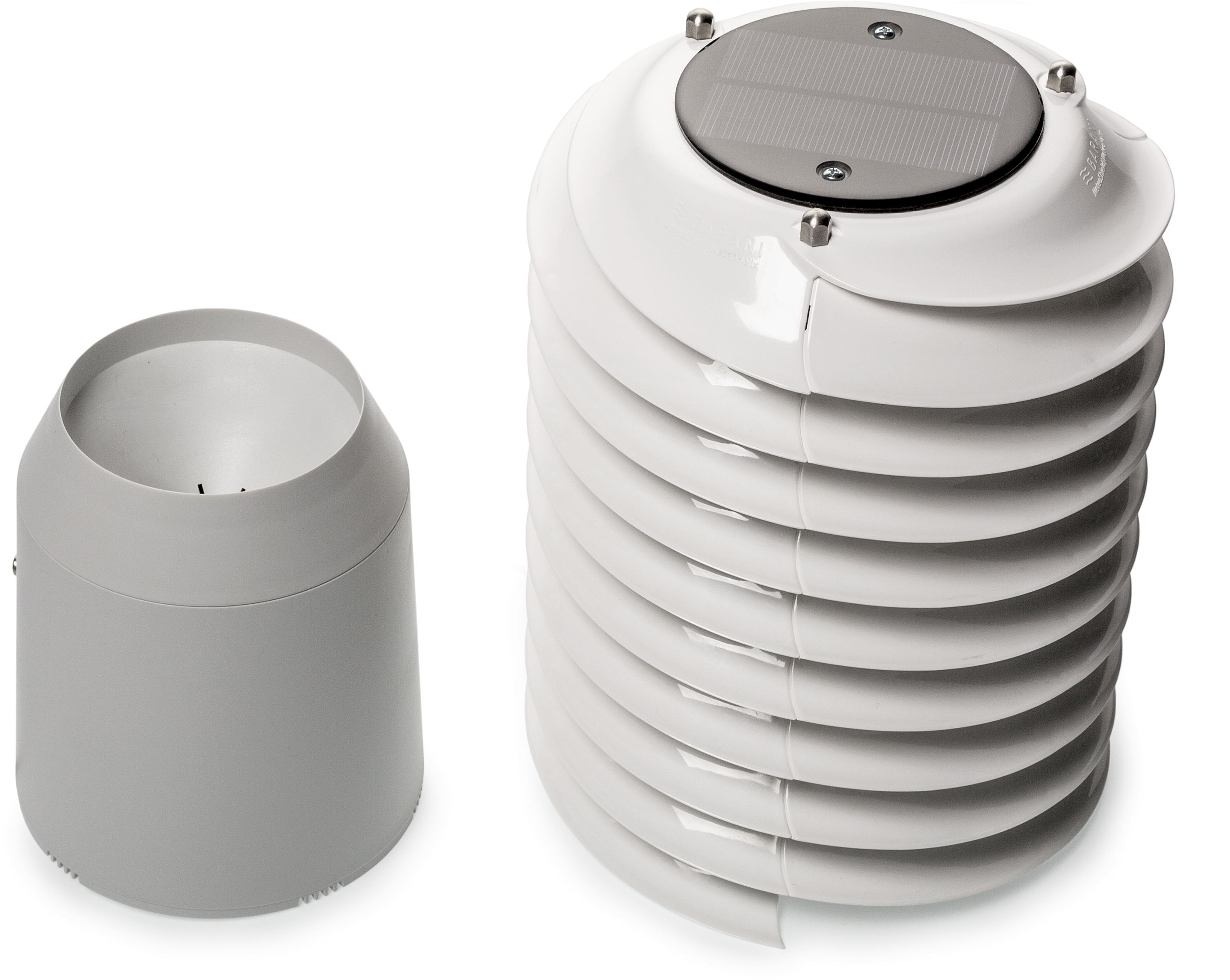 Das Gehäuse besteht aus einer weißen Kunststoff-Helix, durch die die Luft zirkulieren kann. Die Sensoren befinden sich im Inneren und messen dadurch immer die Temperatur im Schatten, auch wenn die Station in der prallen Sonne steht. Eine Solarzelle auf dem Deckel lädt den internen Akku auf – damit entfallen Batteriewechsel oder eine externe Stromversorgung. Mit dem beigelegten Befestigungsmaterial kann man die Helix zum Beispiel an einer Hauswand installieren. Schellen für die Mastmontage gibt es separat.