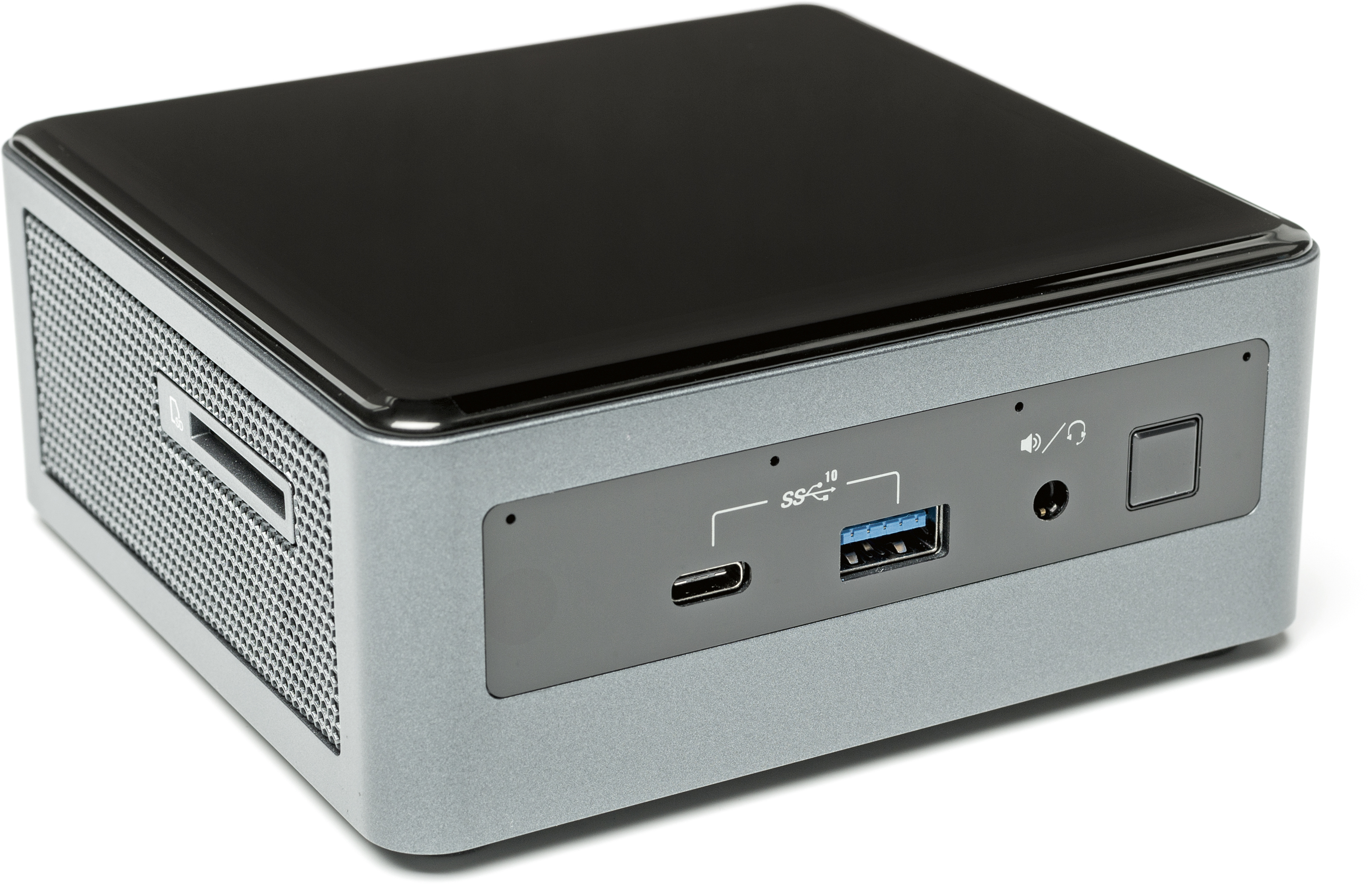Äußerlich hat sich der Kleinstrechner auch in der neuesten Inkarnation NUC10 („Frost Canyon“) kaum verändert: Allein die USB-C-Buchse an der Vorderseite verrät, dass es sich nicht um den Vorgänger der NUC8-Generation handelt.