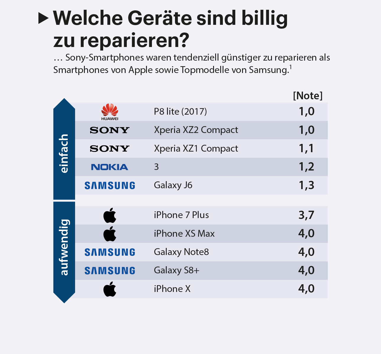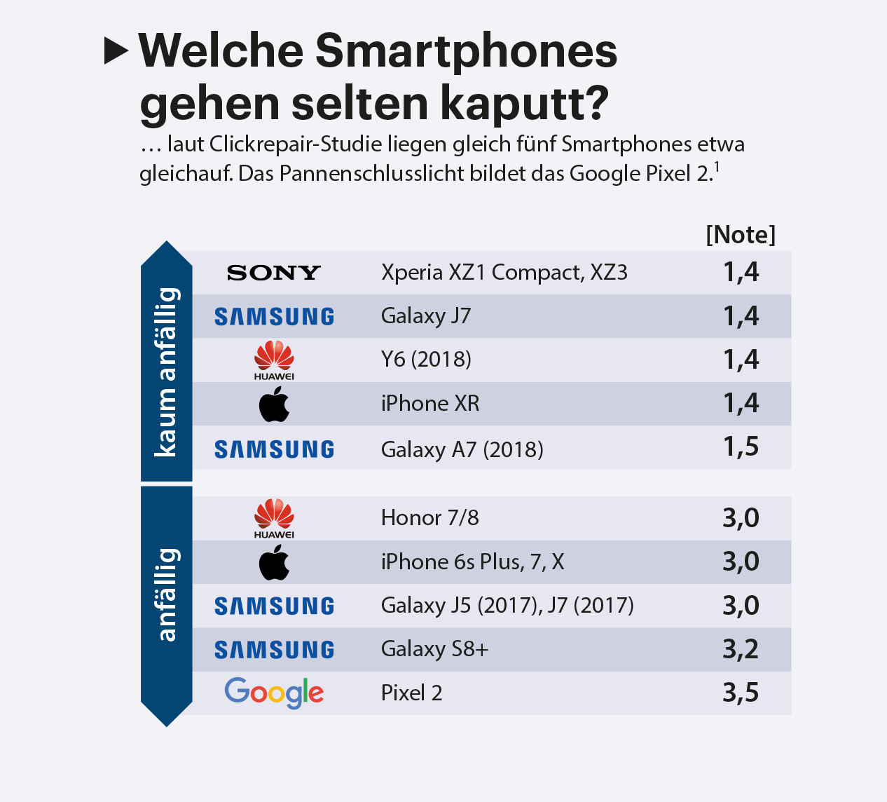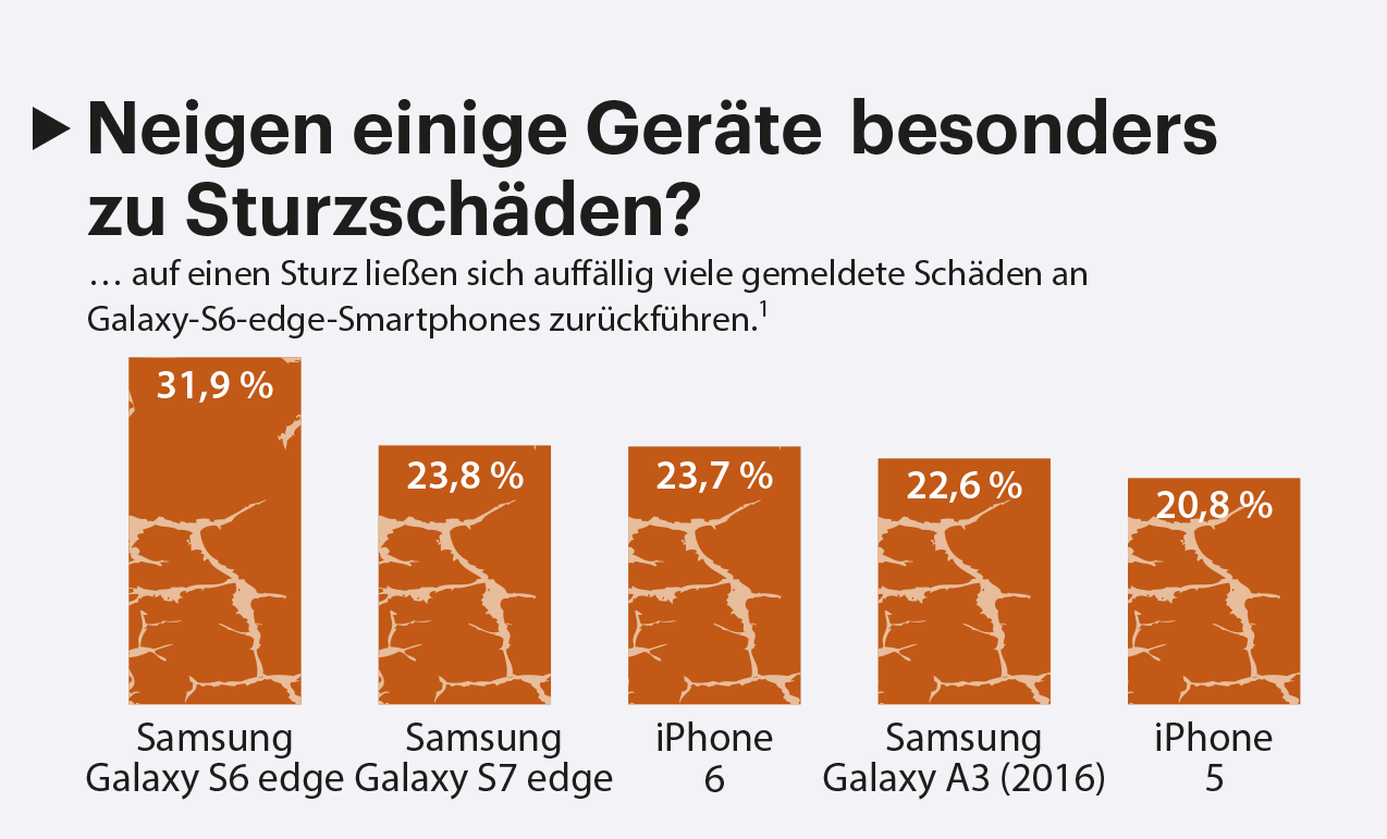 Smartphones gehen als Alltagsgegenstand oft kaputt. Deswegen schließen viele Käufer eine Versicherung ab, welche die Folgen von Schäden abmildern beziehungsweise die Reparatur abwickeln soll. Der Versicherer „Wertgarantie“ hat mit Daten, die über den Reparatur-Marktplatz „Clickrepair“ erhoben wurden, sowie mit einer repräsentativen Statista-Umfrage unter 5126 Teilnehmern (von Mitte April bis Mitte Mai 2019) ermittelt, welche Geräte besonders oft unters Messer müssen oder gar ganz den Geist aufgeben. Aus rund 1,5 Millionen versicherten Smartphones mit und ohne Schäden errechnet die Studie Schulnoten als Indexwert, wodurch man Tendenzen auch über mehrere Jahre erkennen kann. (mil@ct.de)