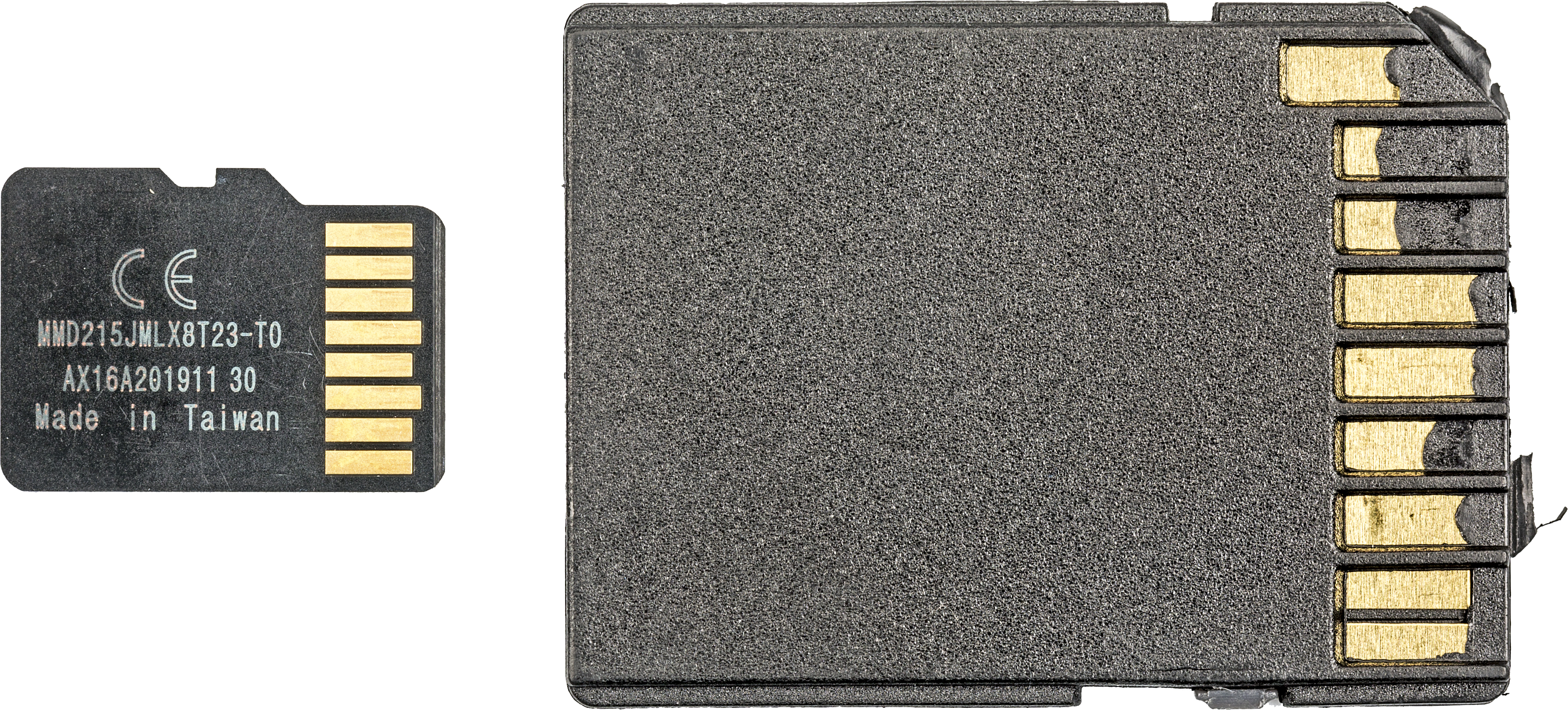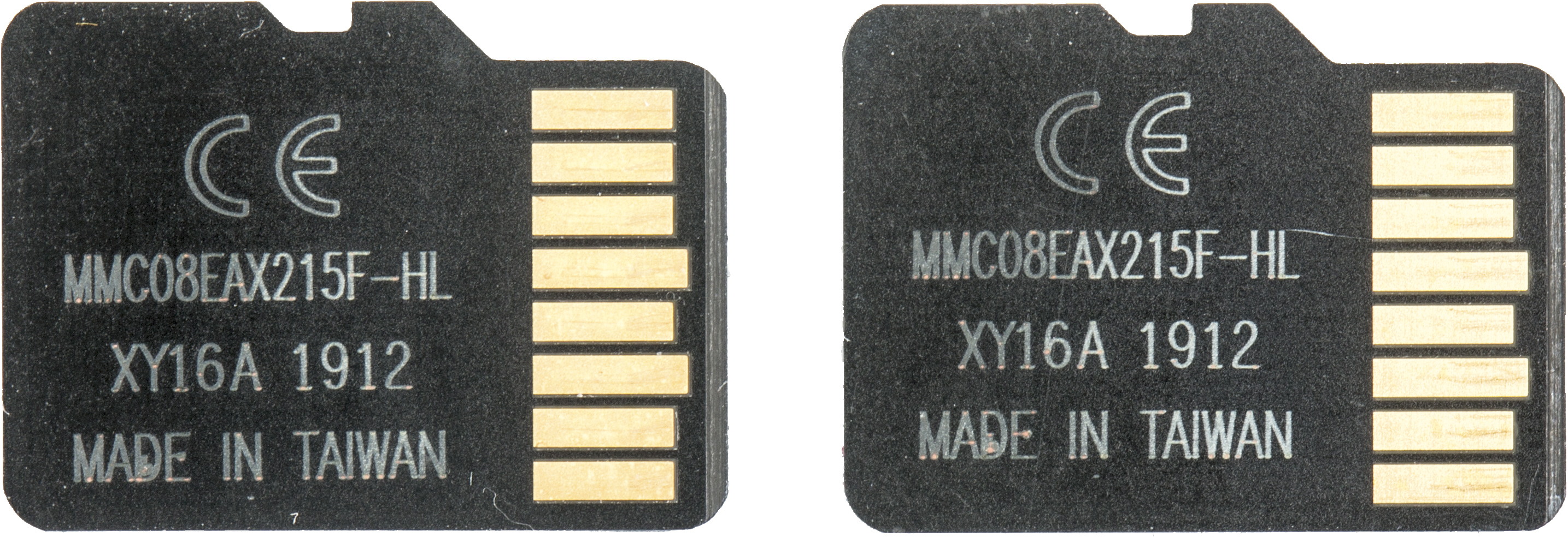 Der blaue USB-Stick mit USB-A- und Micro-USB-Steckern trug keinerlei Beschriftung, nur auf der Verpackungstüte klebte ein winziges Etikett mit dem Aufdruck „2TB“. Vermutlich wird derselbe Stick mit lediglich 4 GByte Flash-Speicher auch für Fälschungen mit 64 GByte bis 1 TByte benutzt, bloß mit jeweils passend manipulierter Firmware. Da lohnt es sich nicht, unterschiedliche Gehäuse anzufertigen. Die mit den Logos von Kingston und Samsung bedruckten MicroSD-Karten wiederum trugen auf der Rückseite jeweils dieselbe eingelaserte Typenbezeichnung „MMC08EAX215F-HL XY16A“ eines unbekannten Herstellers aus Taiwan.