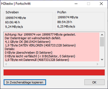 Die bewährte Testsoftware H2testw (siehe ct.de/yjn7) des ehemaligen c’t-Redakteurs Harald Bögeholz enttarnte auch die Fälschungen von Joom.com. Wie bei Fake Flash üblich, dauert die vollständige Prüfung sehr lange, weil sich die Fälschungen nur sehr langsam beschreiben und wieder auslesen lassen – das ist vermutlich Absicht. Im Extremfall dauerte es bei einem „2TB“-Stick insgesamt 6 Tage. Man kann H2testw jedoch anweisen, nur 50 GByte (Eingabe: 50.000 MByte) zu prüfen, denn mehr als 32 GByte „echter“ Speicher steckte in keinem der Prüflinge. Beim Prüfen treten dann nach etwa 4, 8, 16 oder 32 GByte die ersten Fehler auf.