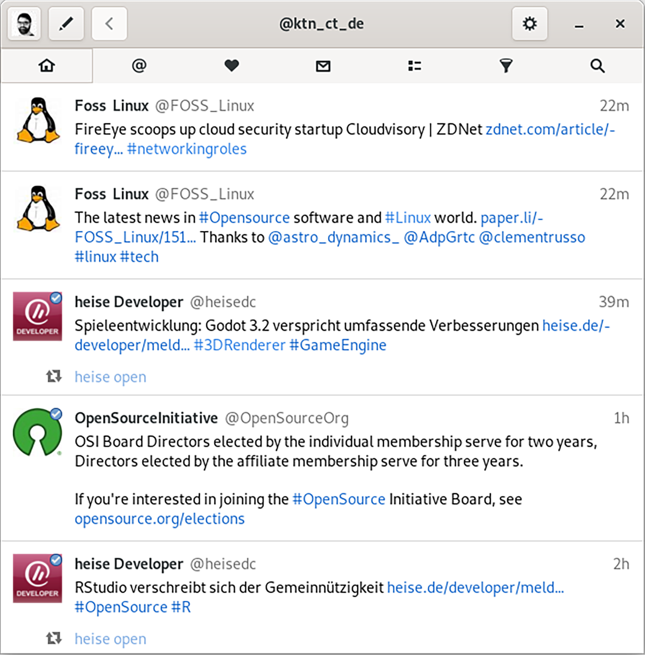 Der Cawbird-Entwickler hingegen begnügt sich mit dem stark eingeschränkten Standard-API. Dessen größter Nachteil: Das Netzwerk benachrichtigt auf diesem Weg Apps nicht über neue Tweets, Likes oder Retweets. Stattdessen muss Cawbird selbst abfragen, ob neue Nachrichten vorliegen. Polling statt Push und das nur alle zwei Minuten.